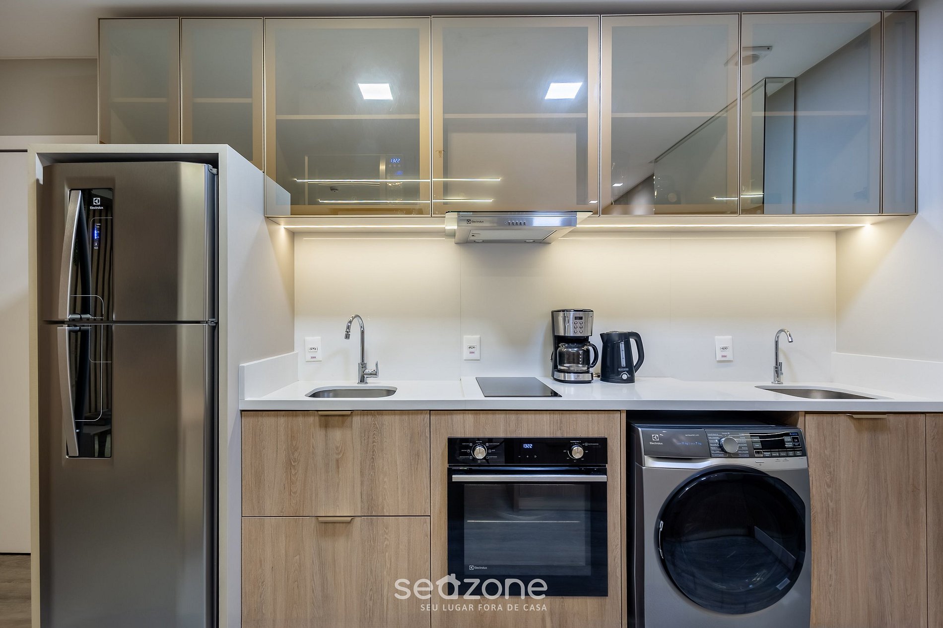 - Cozinha completa com geladeira, fogão cooktop (indução), forno elétrico, micro-ondas, cafeteira elétrica, panelas, louças e utensílios;