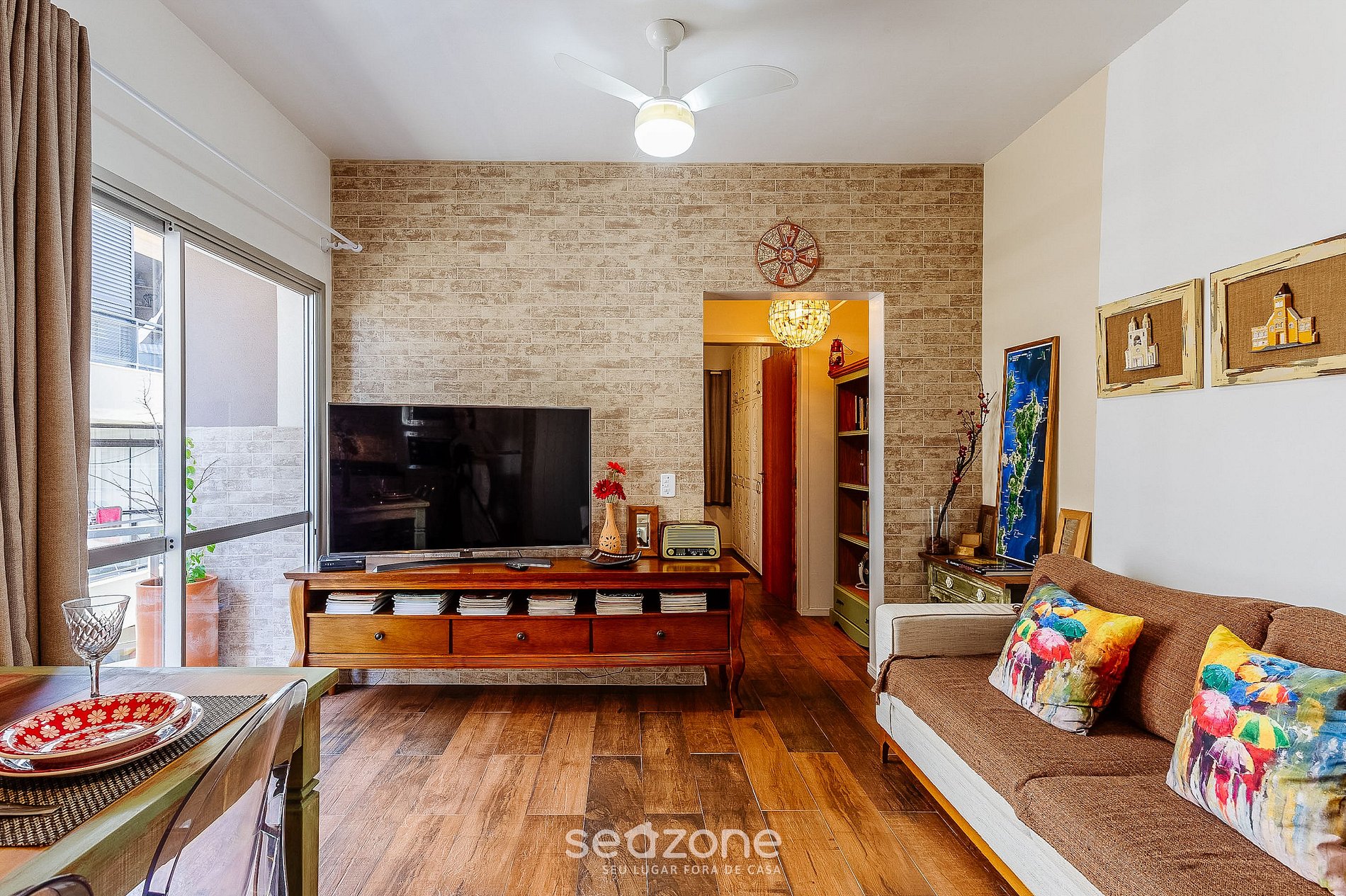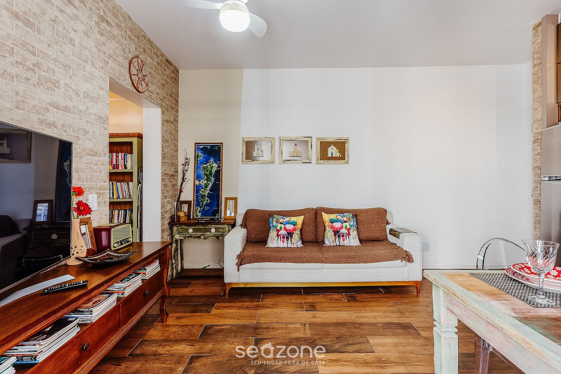 - Sala de estar com sofá, ventilador e TV;
