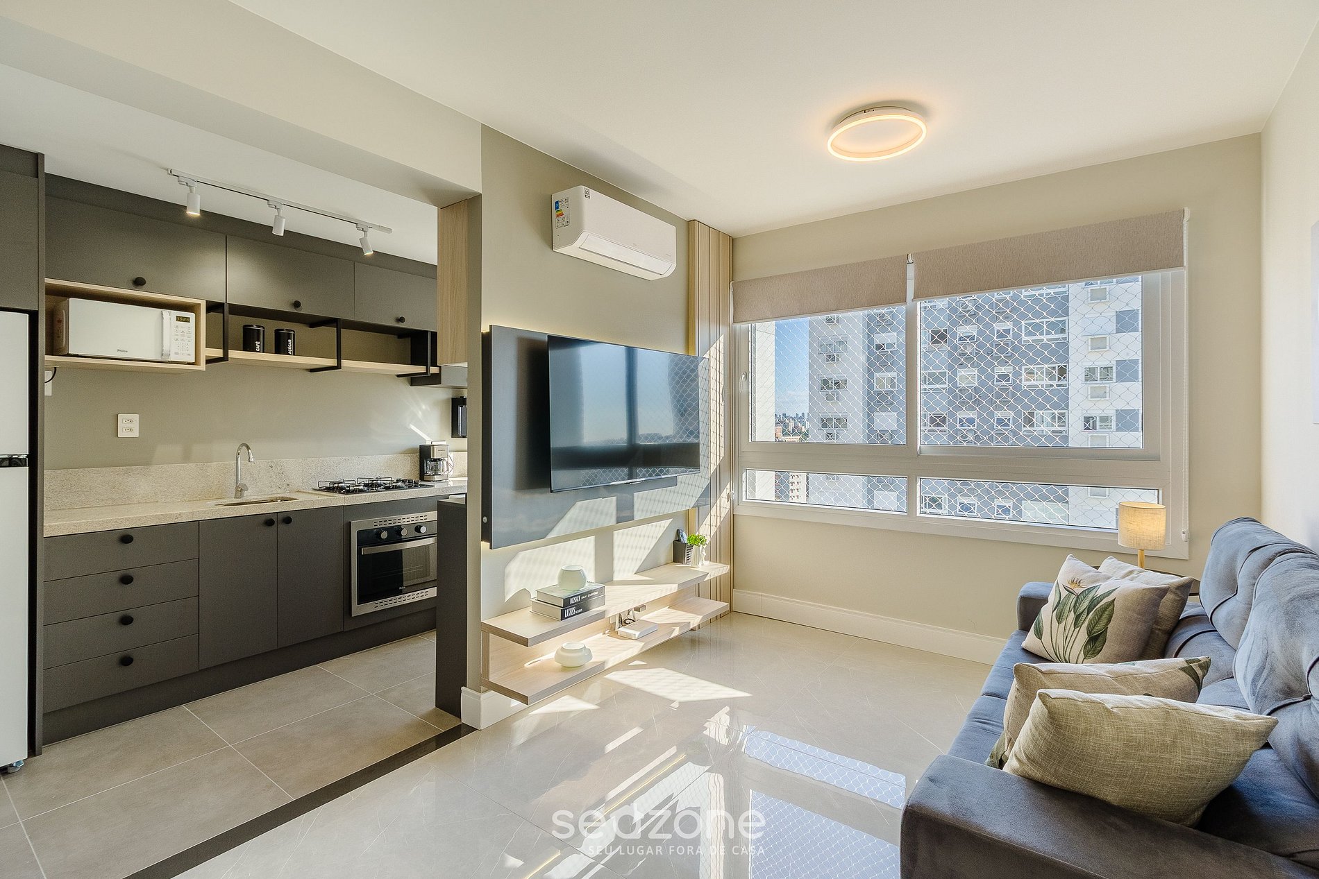 - Sala de estar com sofá, smart TV e ar-condicionado;