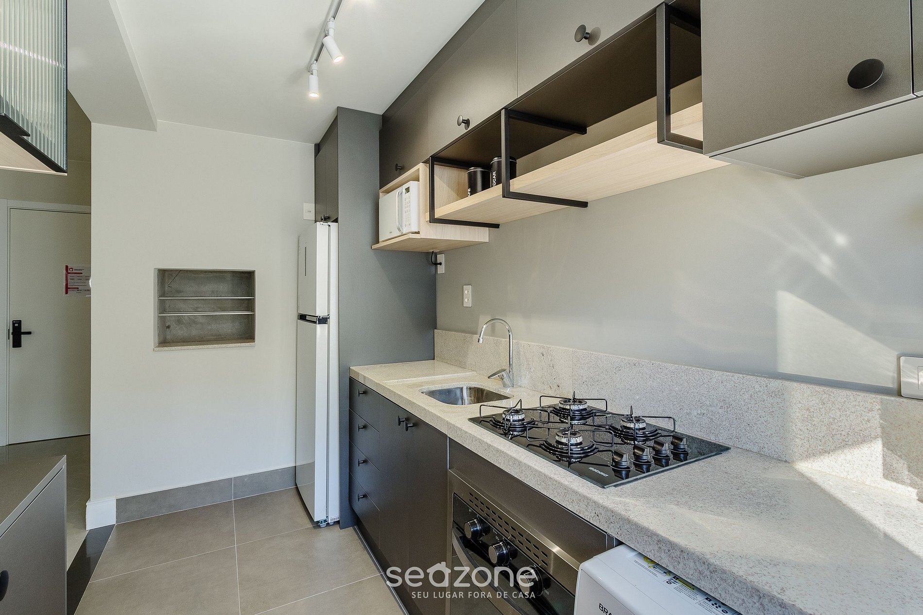 - Cozinha completa com geladeira, fogão cooktop (gás), forno elétrico, micro-ondas, sanduicheira, cafeteira elétrica, chaleira elétrica, liquidificador, taças de vinho, panelas, louças e utensílios;
