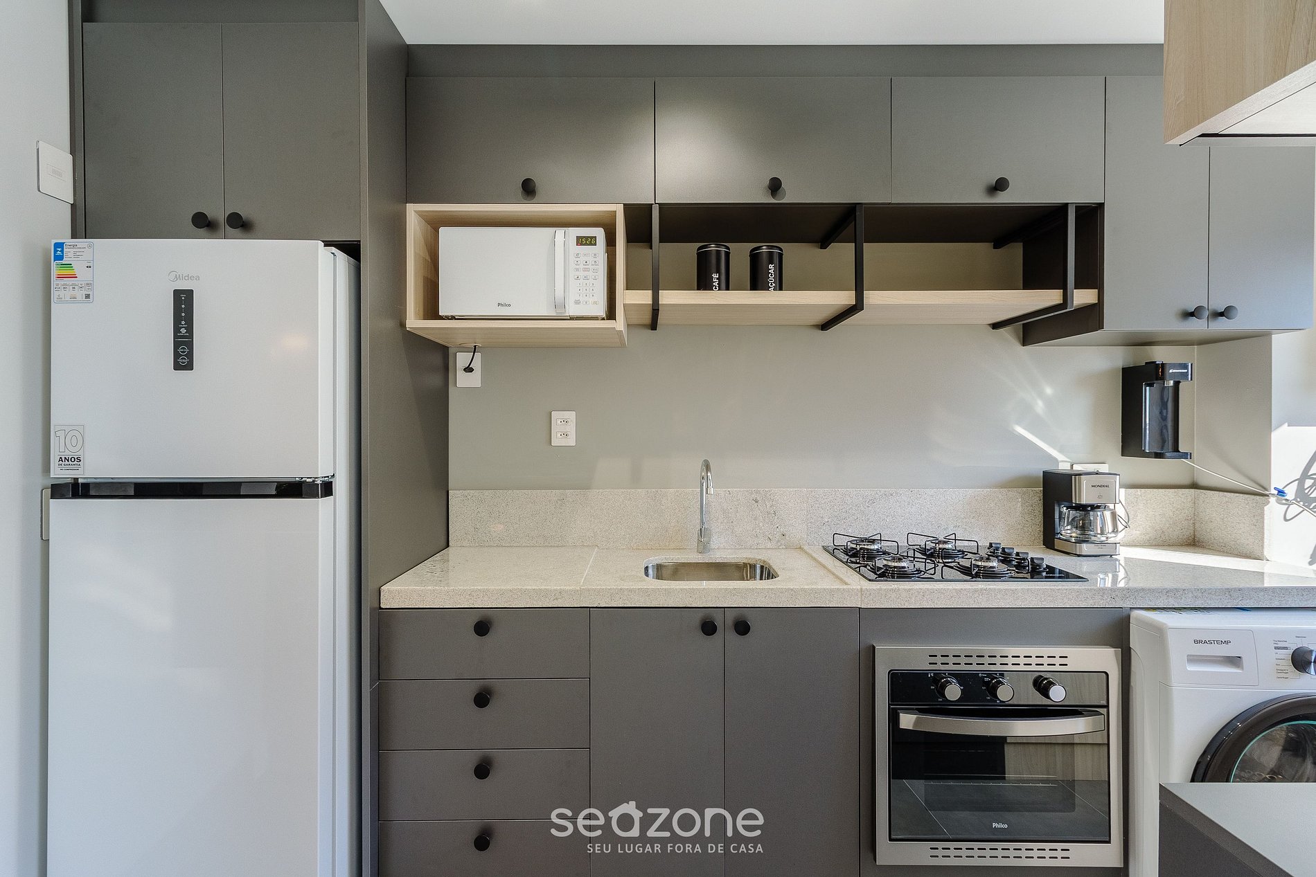 - Cozinha completa com geladeira, fogão cooktop (gás), forno elétrico, micro-ondas, sanduicheira, cafeteira elétrica, chaleira elétrica, liquidificador, taças de vinho, panelas, louças e utensílios;