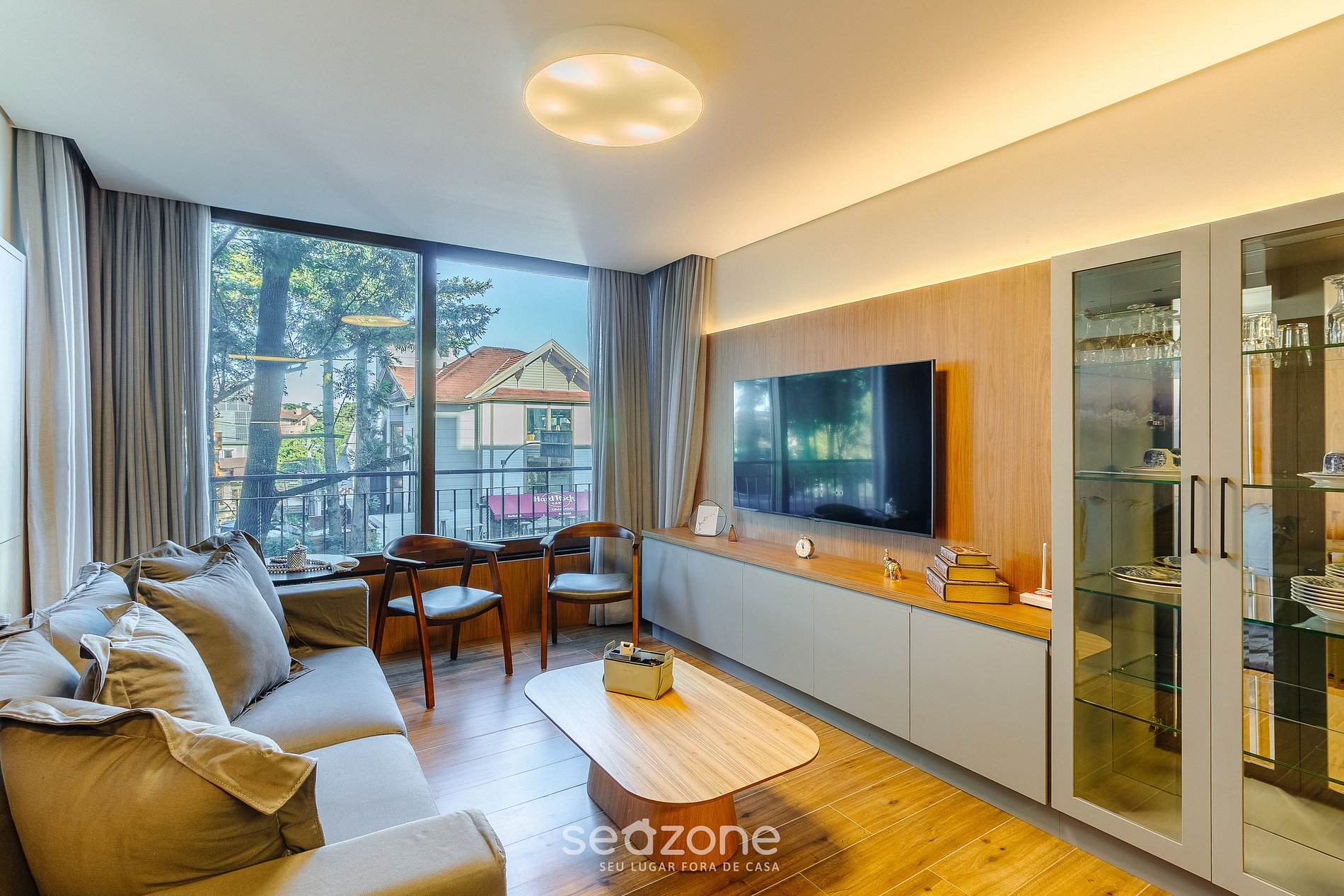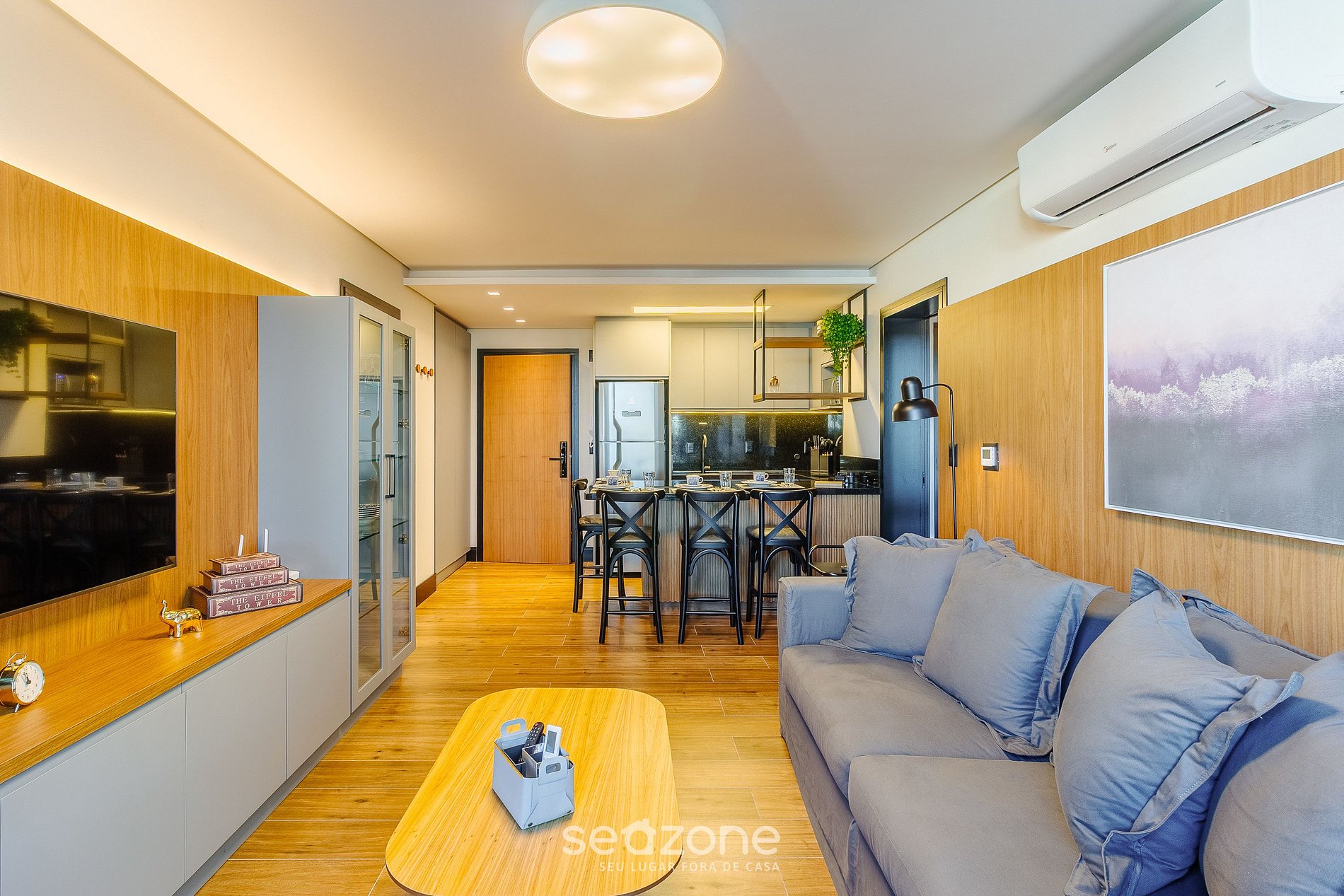 - Sala de estar com sofá, 2 cadeiras, Smart TV e ar-condicionado;