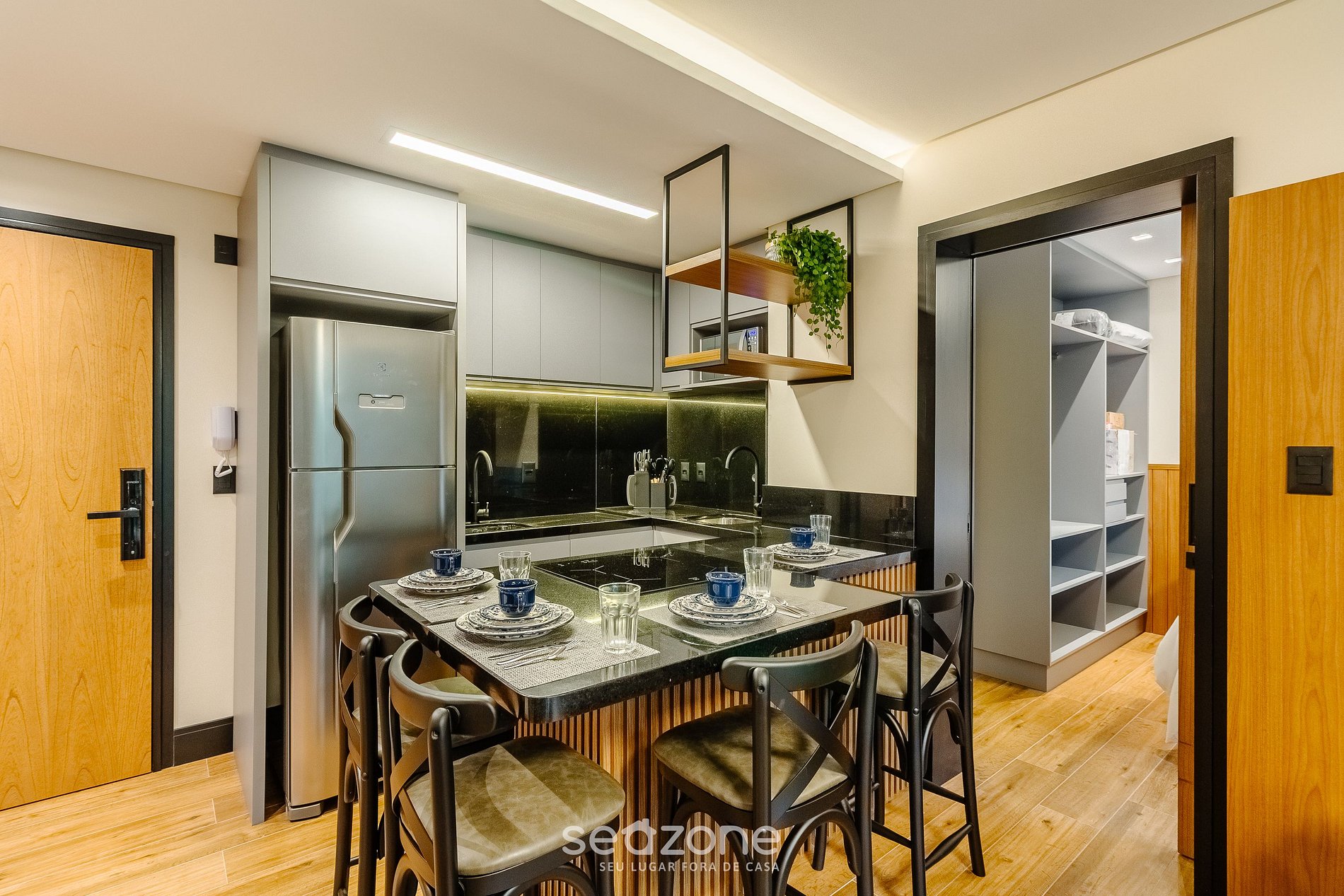 - Espaço para jantar com bancada com 4 cadeiras;