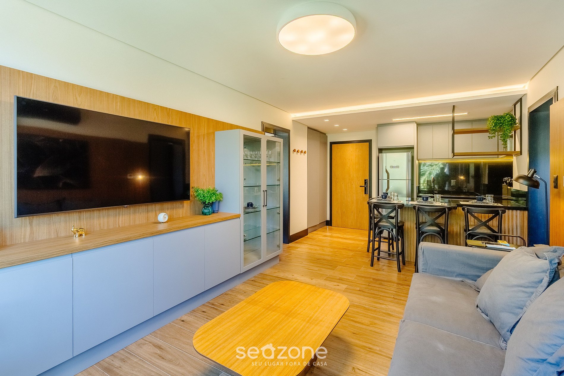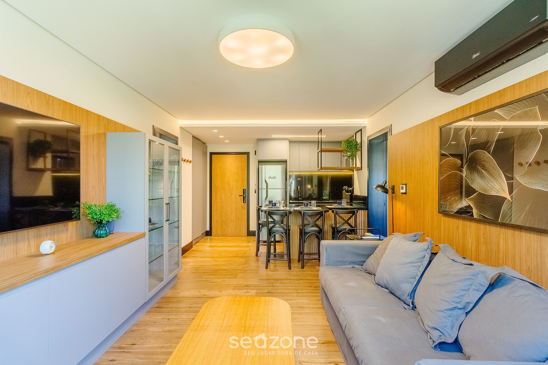 - Sala de estar com sofá, Smart TV e ar-condicionado;