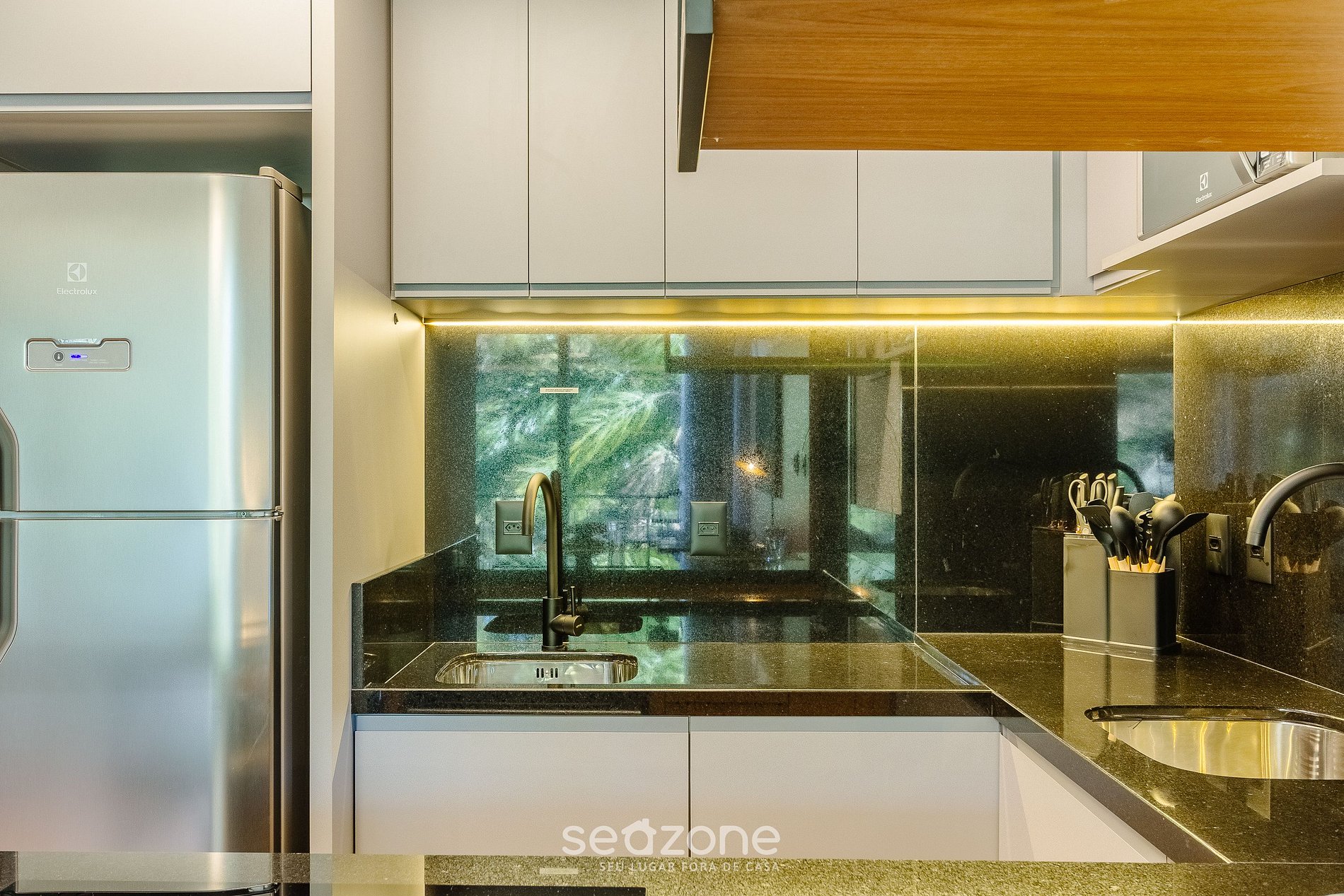 - Cozinha completa com geladeira, cooktop por indução, forno elétrico, micro-ondas, sanduicheira, cafeteira elétrica, chaleira elétrica, liquidificador, taças de vinho, panelas, louças e utensílios;