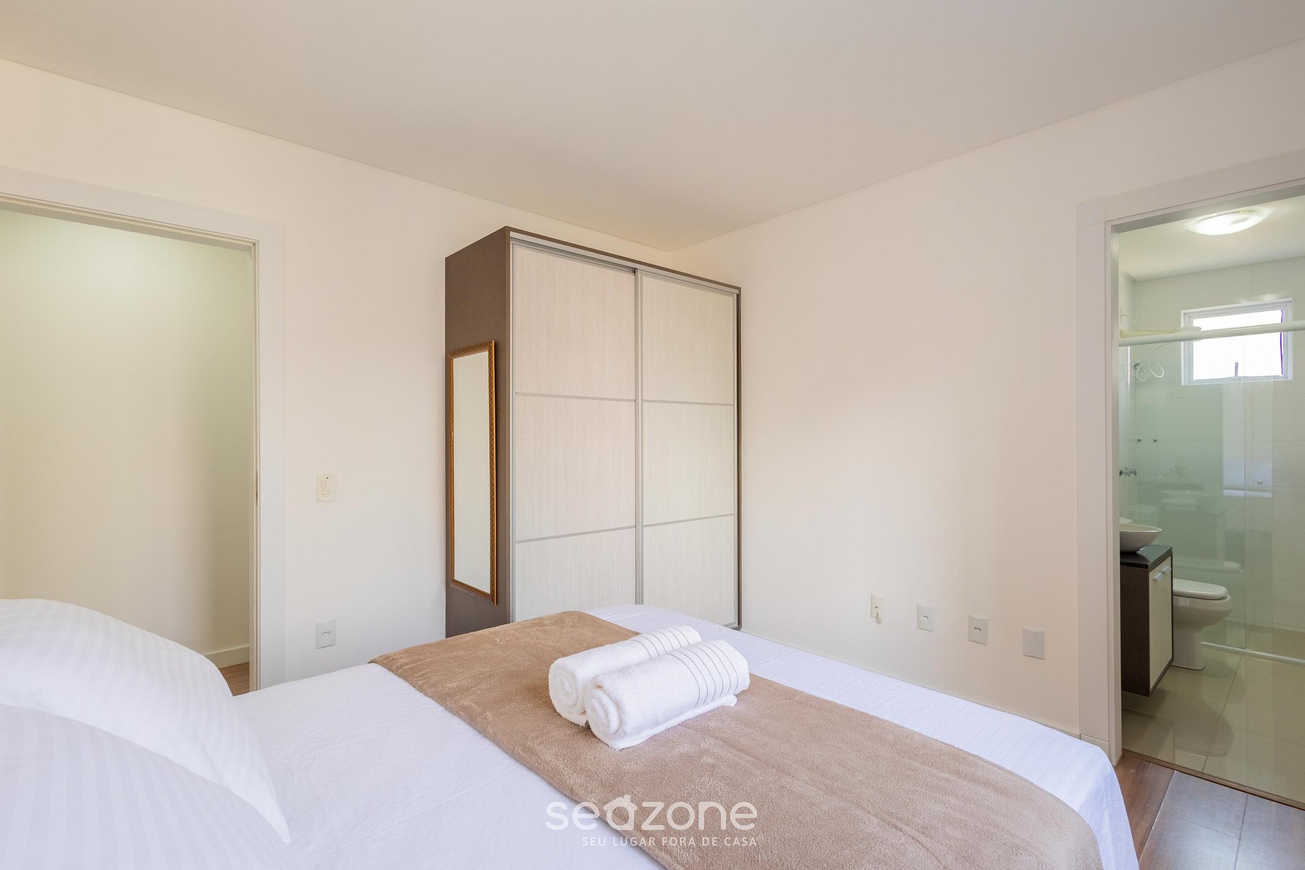 - 1 Suíte com cama de casal, armário e ar-condicionado;