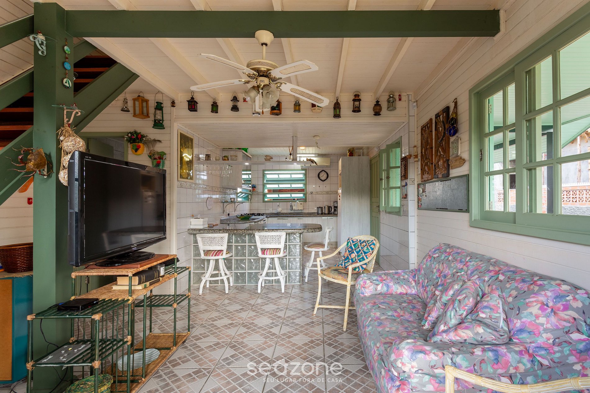 - Sala de estar com sofá e TV;