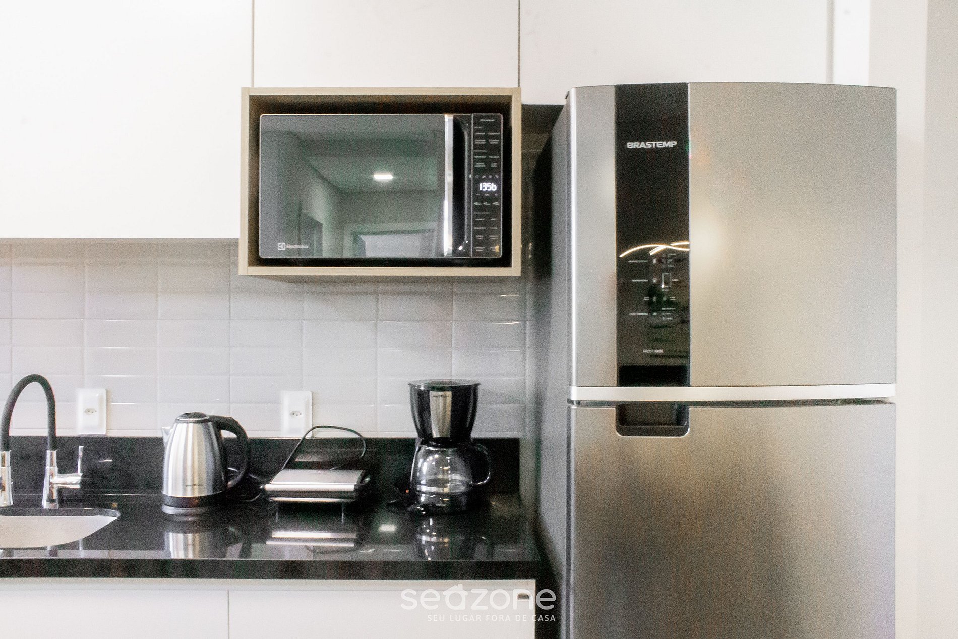 - Cozinha completa com geladeira, fogão cooktop, forno elétrico, micro-ondas, sanduicheira, cafeteira, chaleira elétrica, liquidificador, panelas, louças e utensílios;