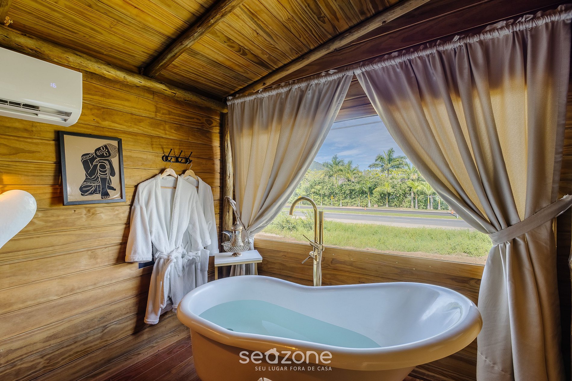 - Banheira no mezanino com vista para área verde e a estrada ao fundo;