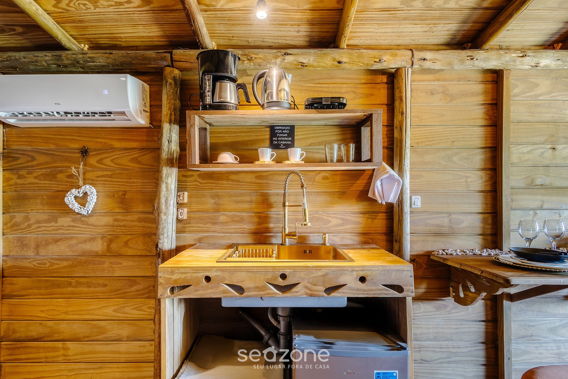 - Cozinha completa com frigobar, micro-ondas, cafeteira elétrica, liquidificador, taças de vinho, louças e utensílios;