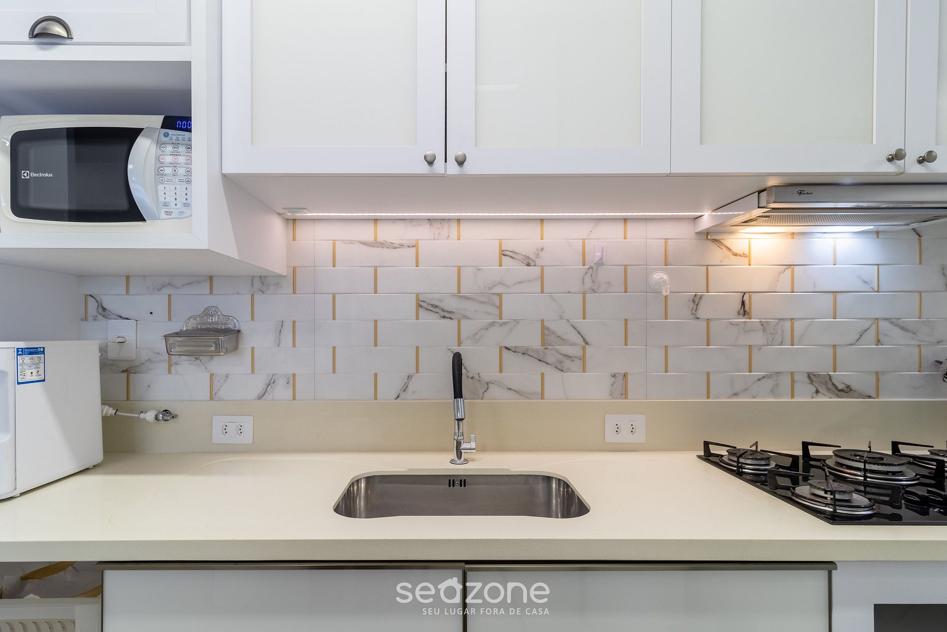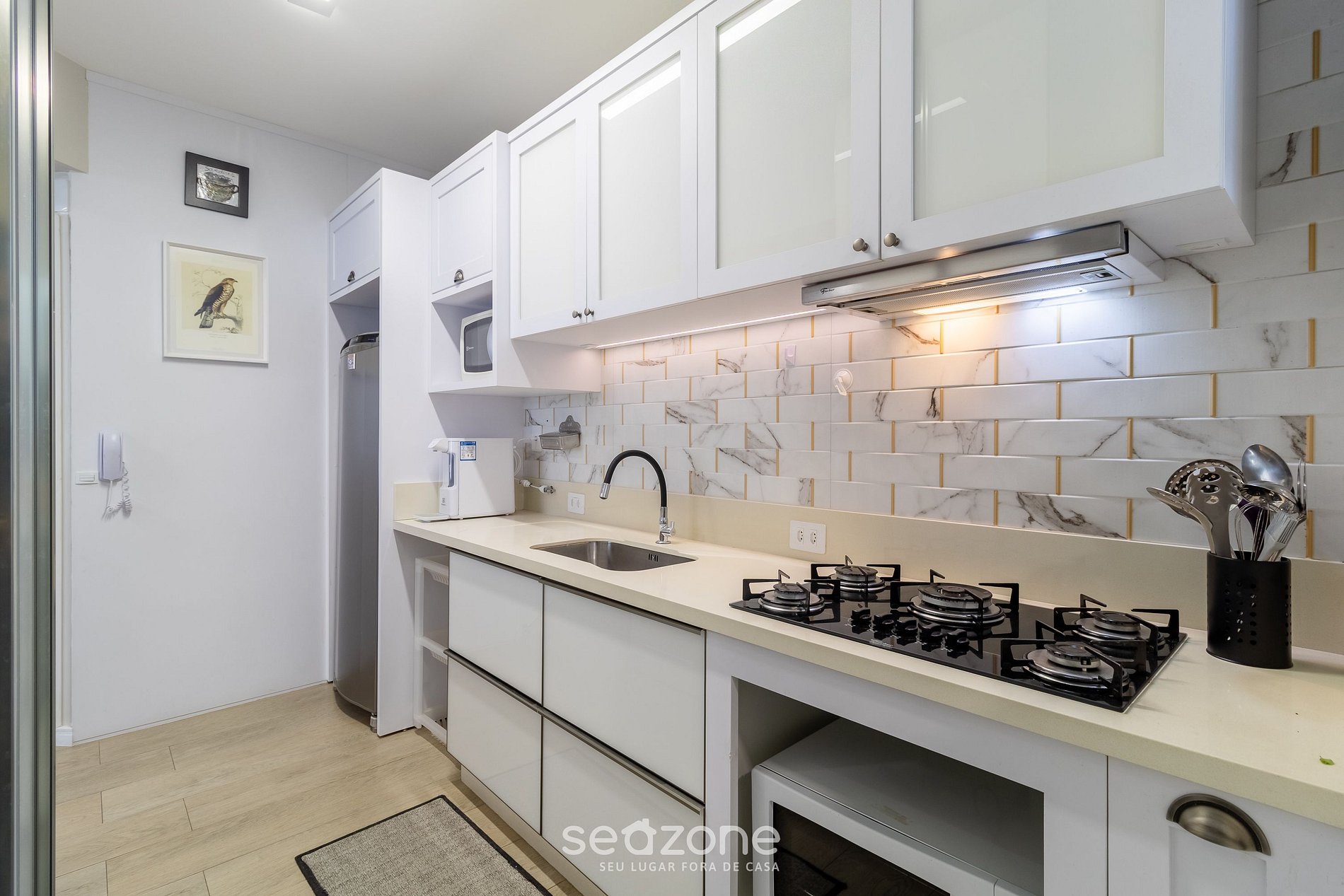 - Cozinha completa com geladeira, fogão cooktop (gás), forno elétrico, micro-ondas, cafeteira elétrica, taças de vinho, panelas, louças e utensílios;