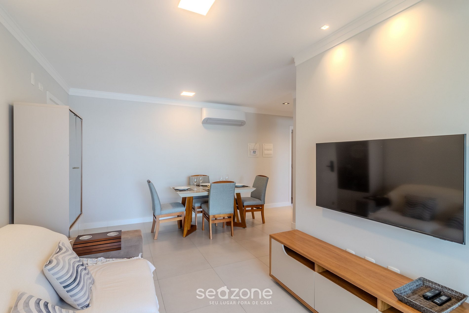 - Sala de estar com sofá, Smart TV e ar-condicionado;