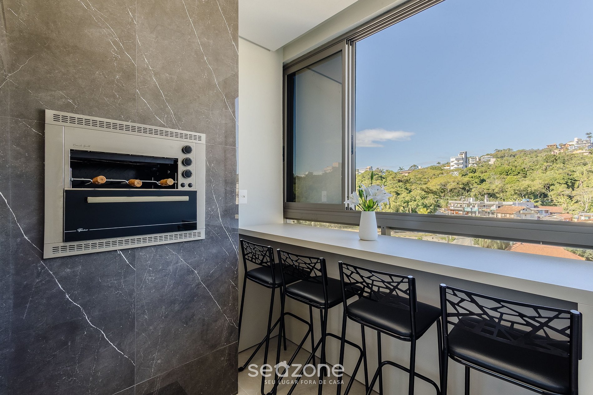 - Varanda gourmet com churrasqueira e vista para a cidade;
