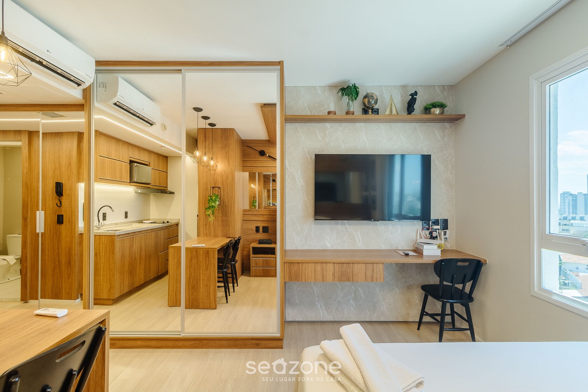 Cozinha equipada, TV smart, Wi-Fi de alta velocidade e check-in sem chave e ar condicionado nos ambientes e para você ter o máximo de conforto.