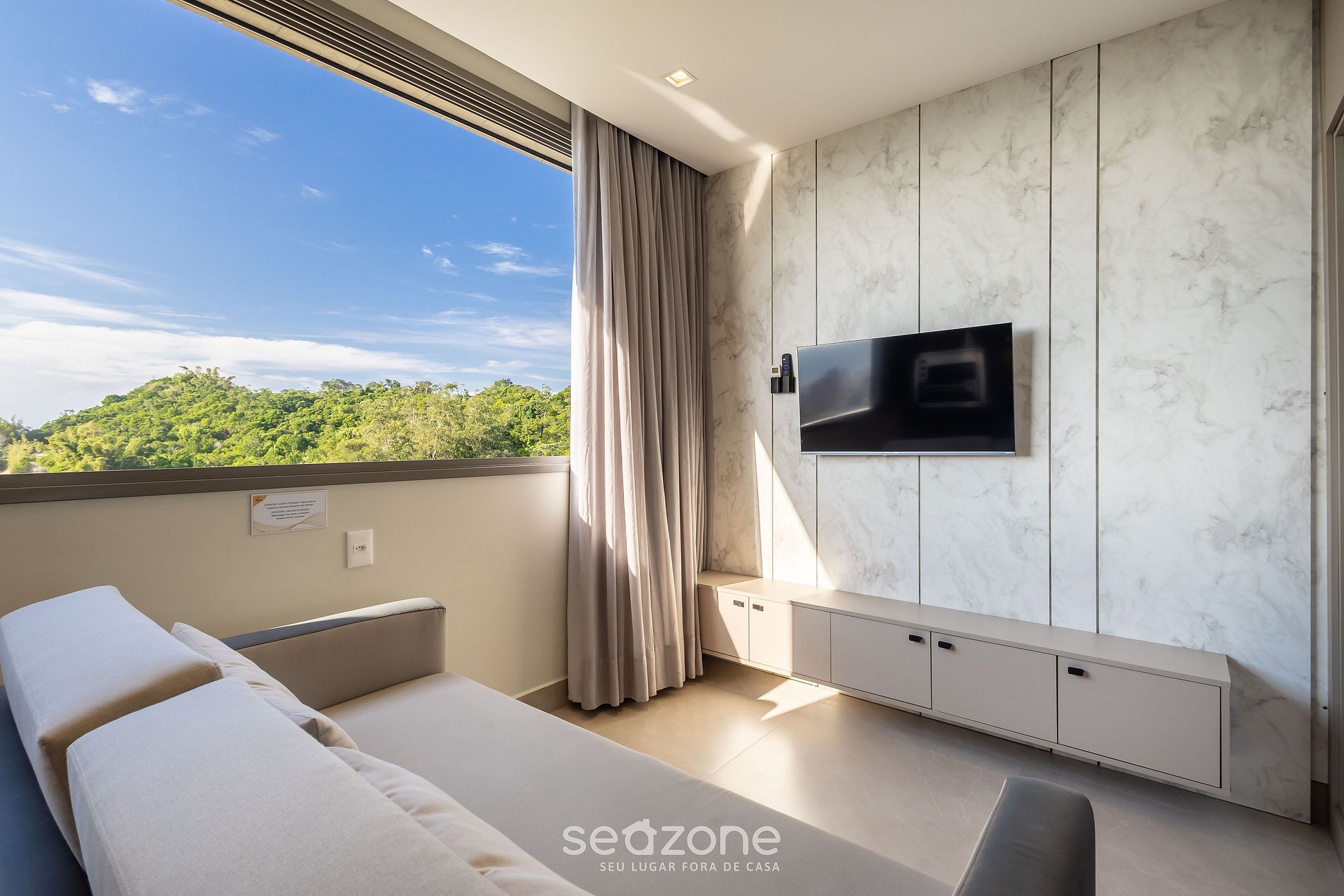 - Sala de estar com sofá-cama de casal, Smart TV e ar-condicionado;