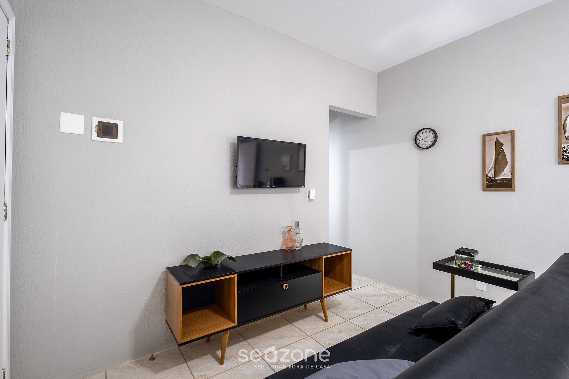 - Sala de estar com sofá-cama, Smart Tv e ventilador de teto;