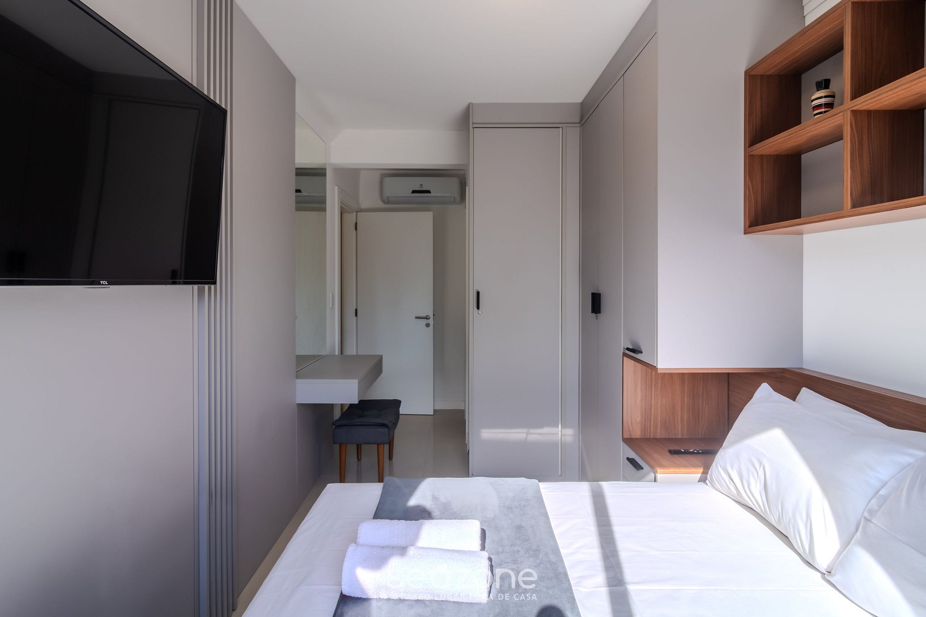 - 1 Suíte com cama de casal, Smart Tv, armário e ar-condicionado;