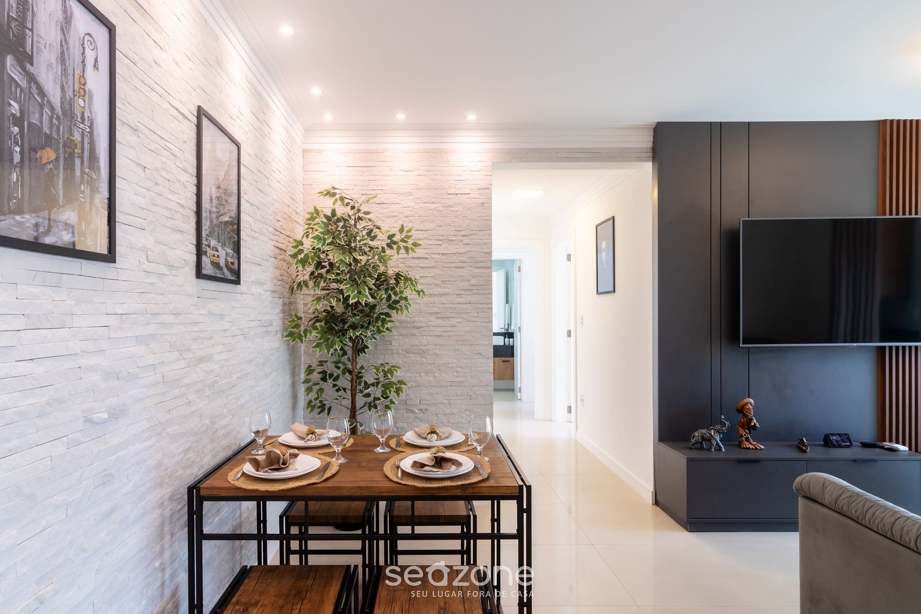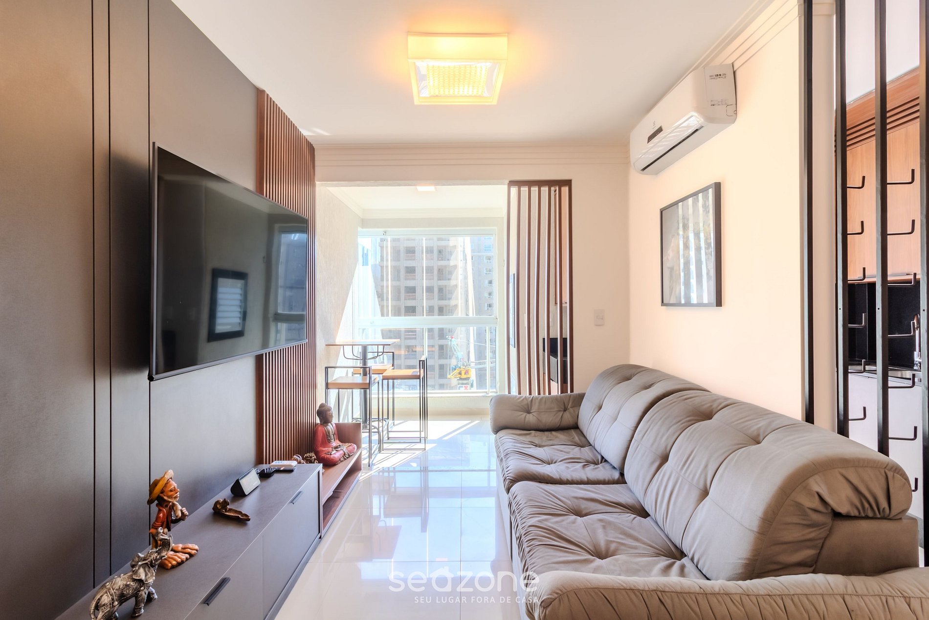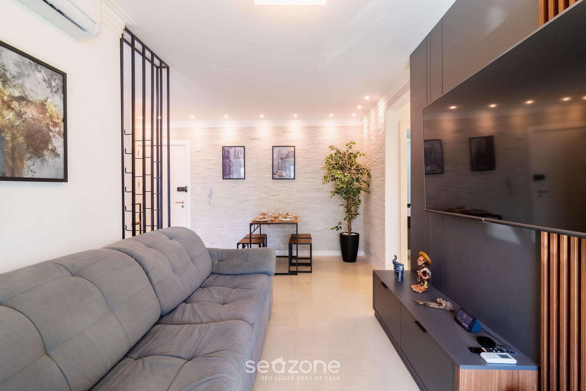 - Sala de estar com sofá, Smart TV e ar-condicionado;