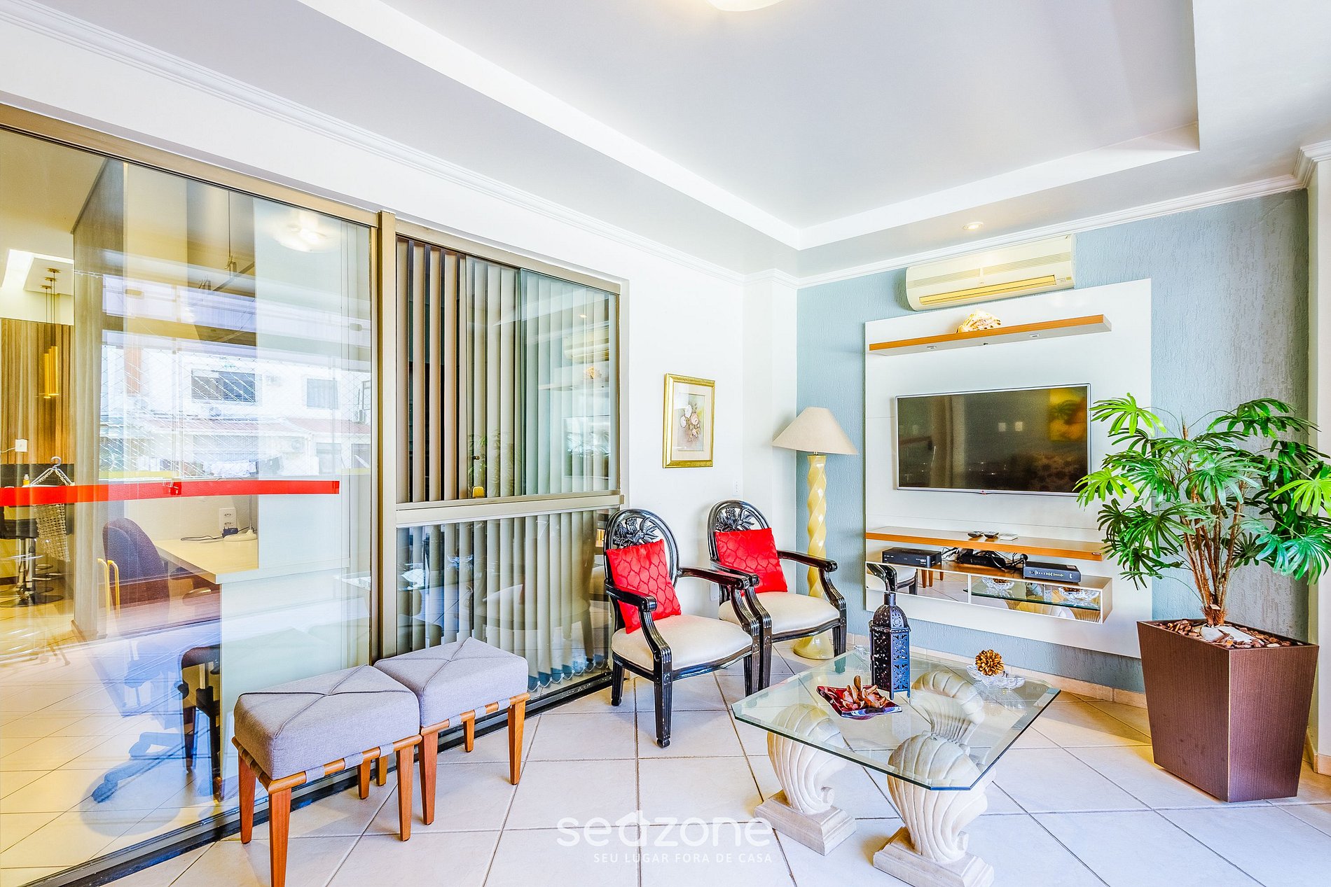 - Sala de estar com sofá-cama solteiro, 2 bancos, 2 cadeiras, Smart TV e ar-condicionado;