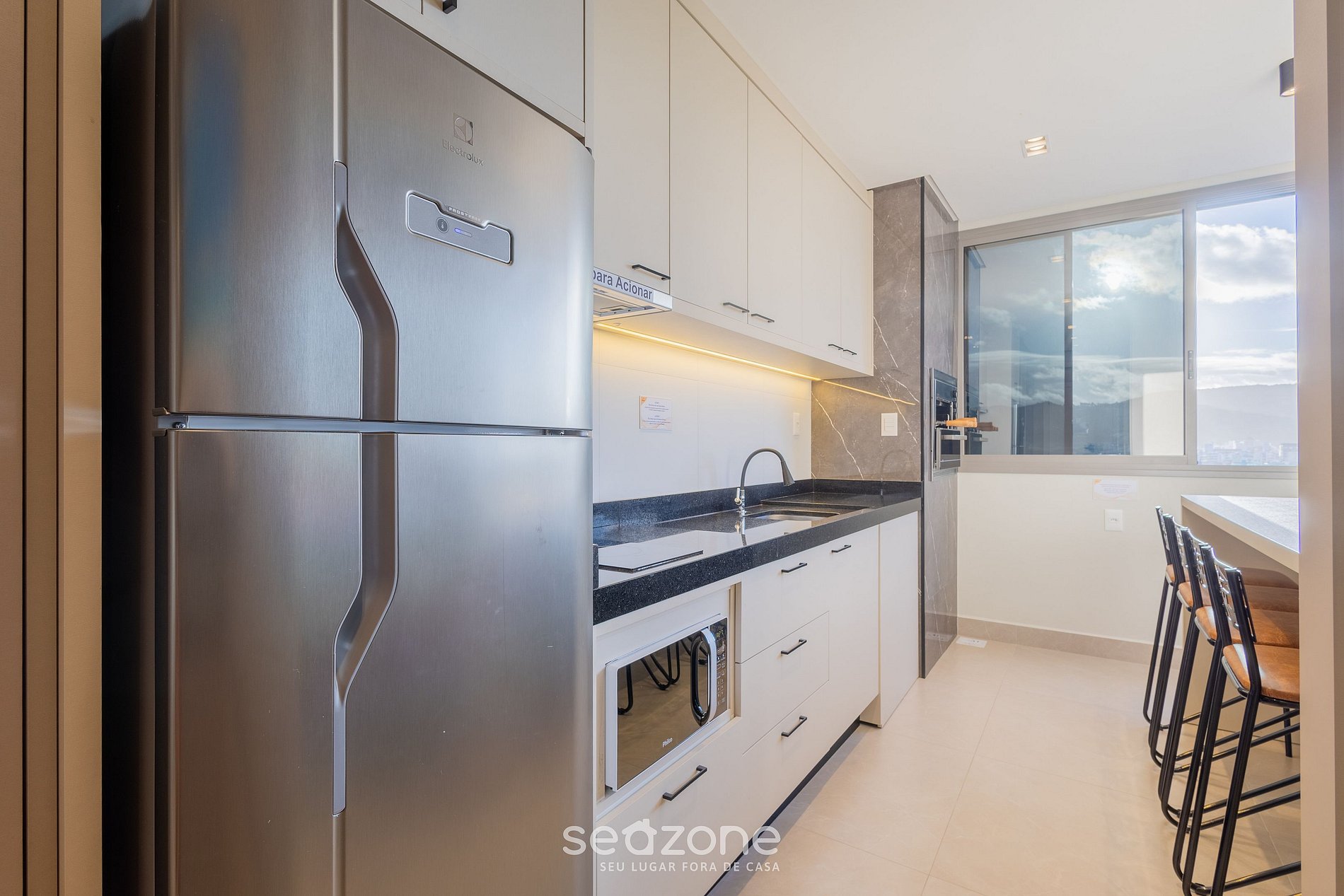 - Cozinha completa com geladeira, cooktop, micro-ondas, Airfryer, sanduicheira, Kit café (suporte para filtro, garrafa térmica), chaleira elétrica, liquidificador, taças de vinho, panelas, louças e utensílios;