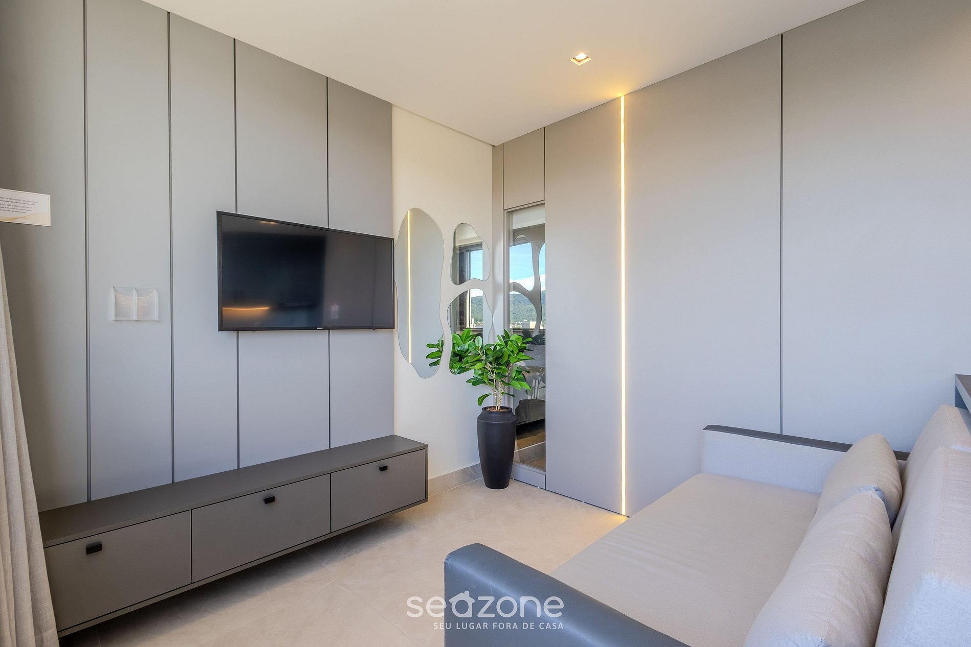 - Sala de estar com sofá-cama de casal, Smart TV e ar-condicionado;
