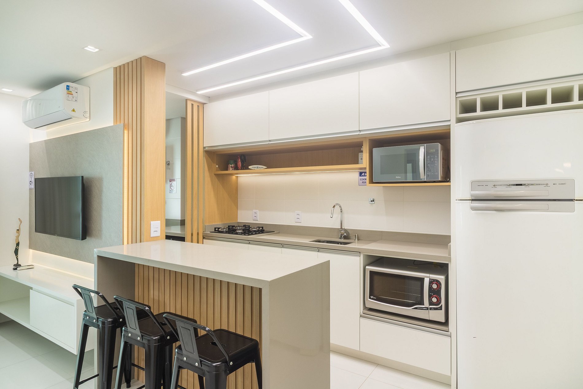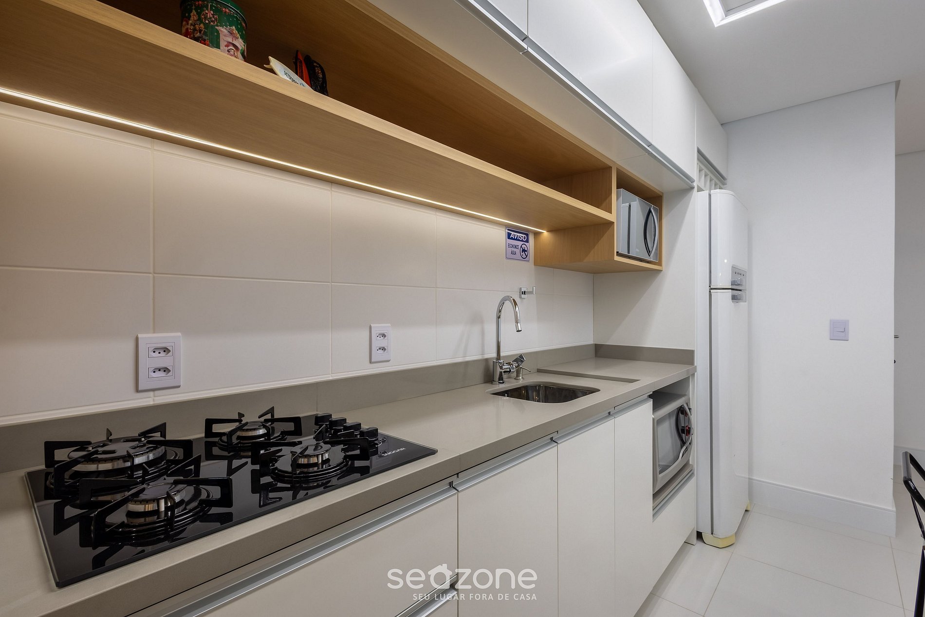 - Cozinha completa com geladeira, fogão cooktop (a gás), forno elétrico, sanduicheira, microondas, Kit café (suporte para filtro, garrafa térmica), chaleira elétrica, liquidificador, taças de vinho, panelas, louças e utensílios;