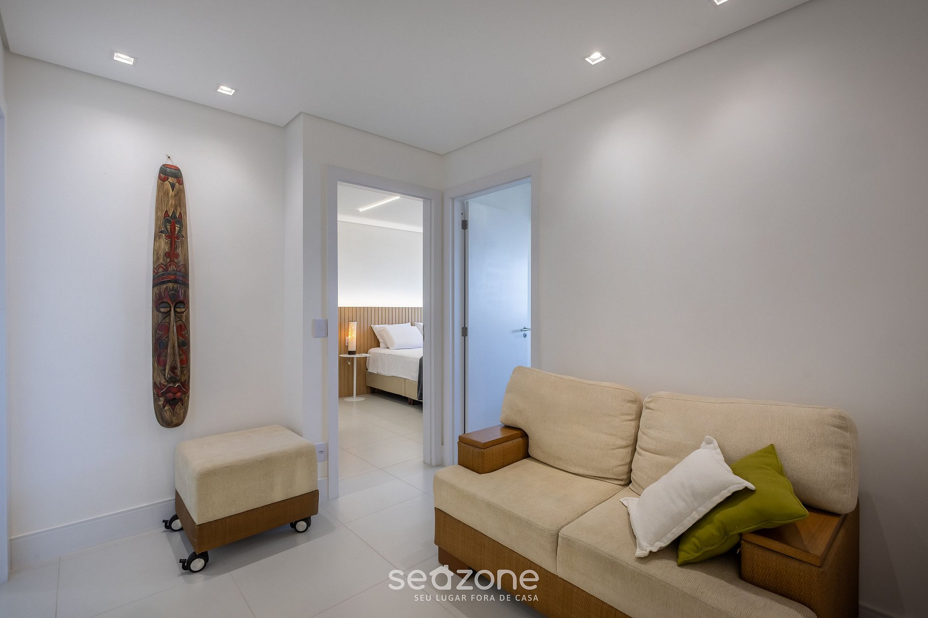 - Sala de estar com sofá, 2 puffs, Smart TV e ar-condicionado;