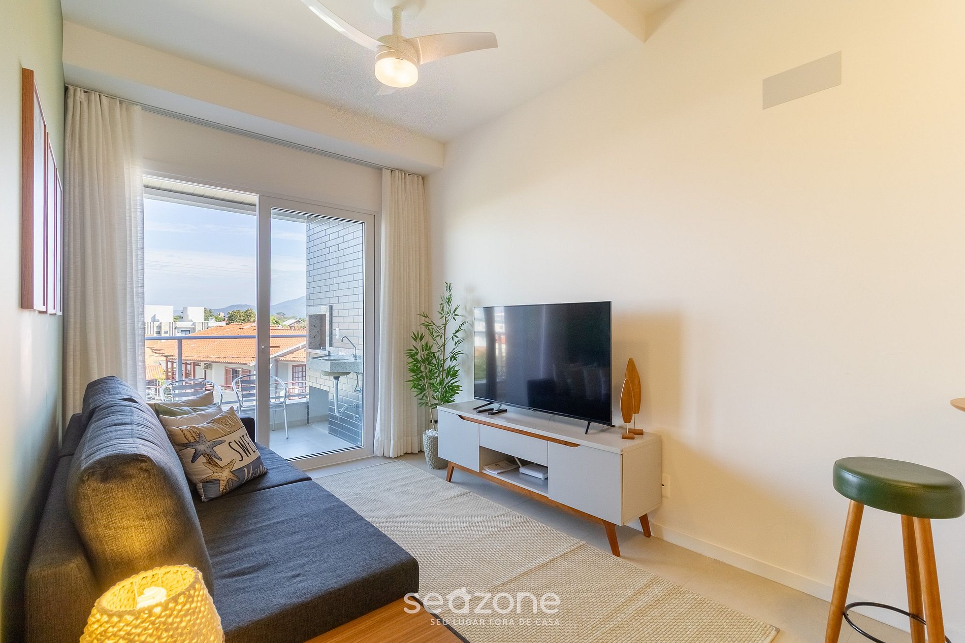 - Sala de estar com sofá, ventilador de teto e Smart TV;