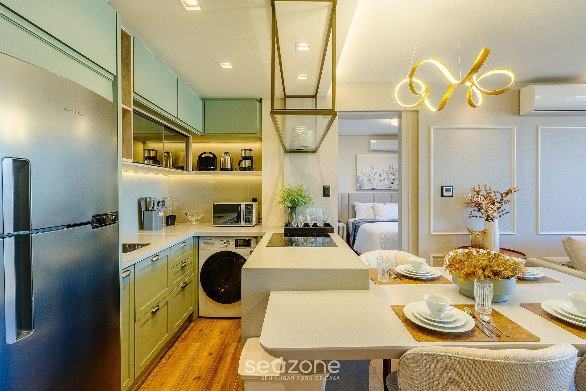 - Cozinha completa com geladeira, fogão por indução, forno elétrico, microondas, cafeteira, chaleira elétrica, liquidificador, sanduicheira, taças de vinho, panelas, louças e utensílios;