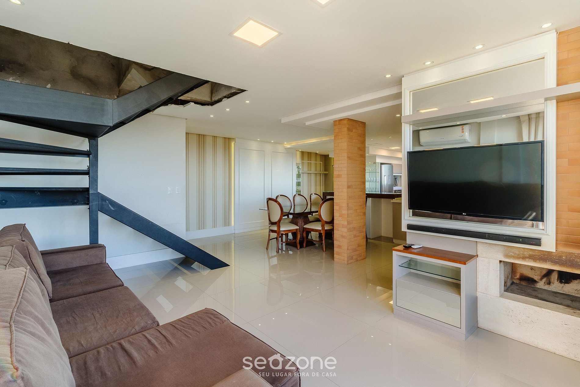 - Sala de estar com sofá, Smart TV, lareira e ar-condicionado;