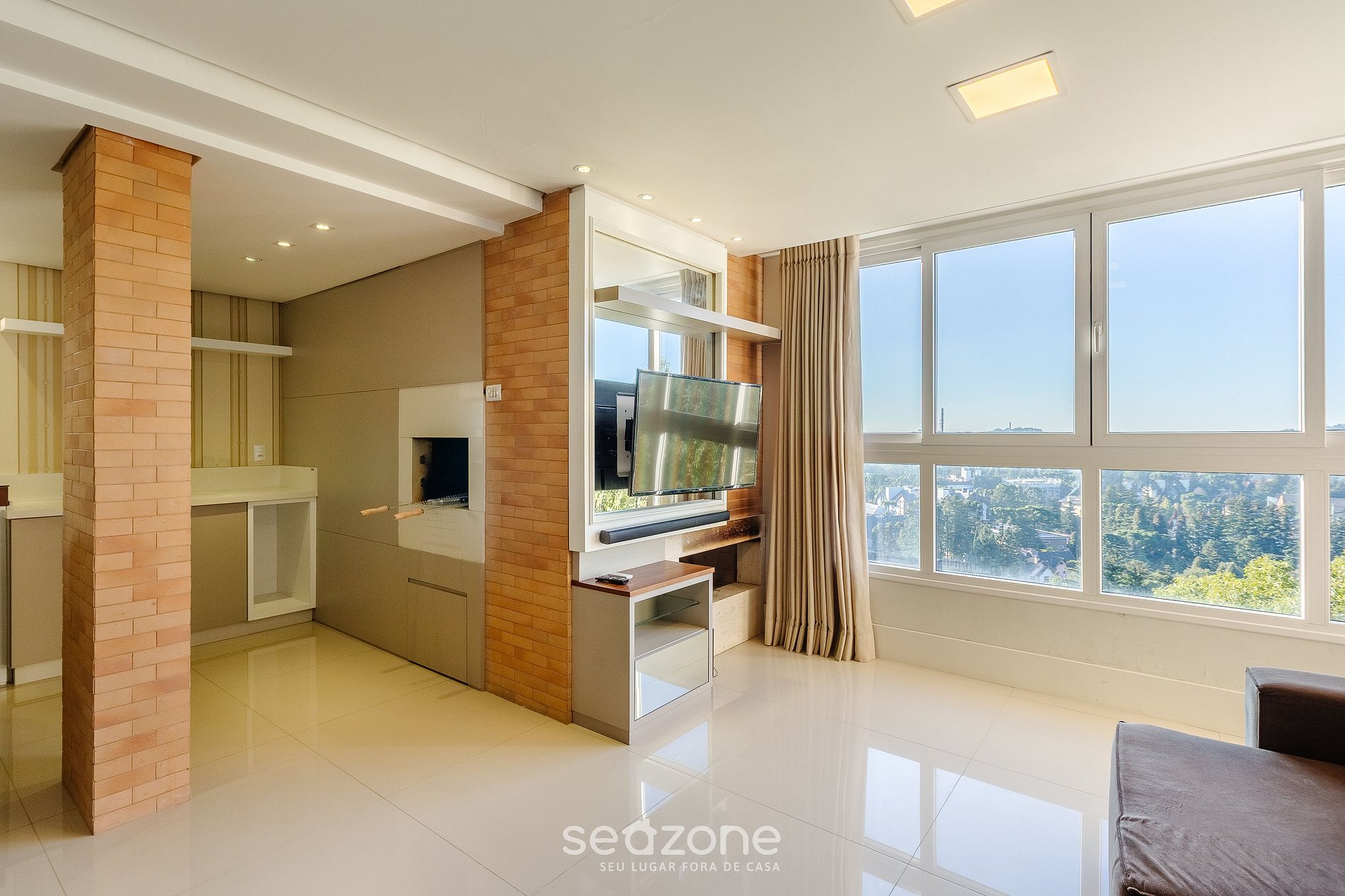 - Sala de estar com sofá, Smart TV, lareira e ar-condicionado;