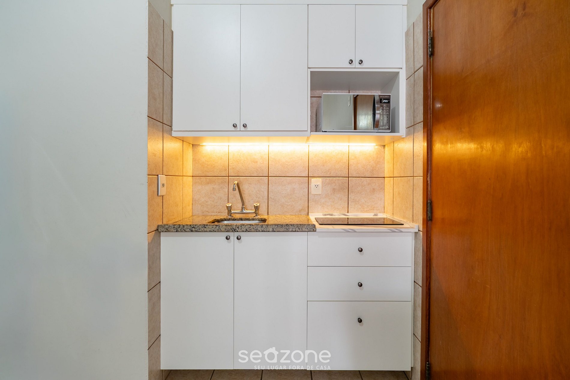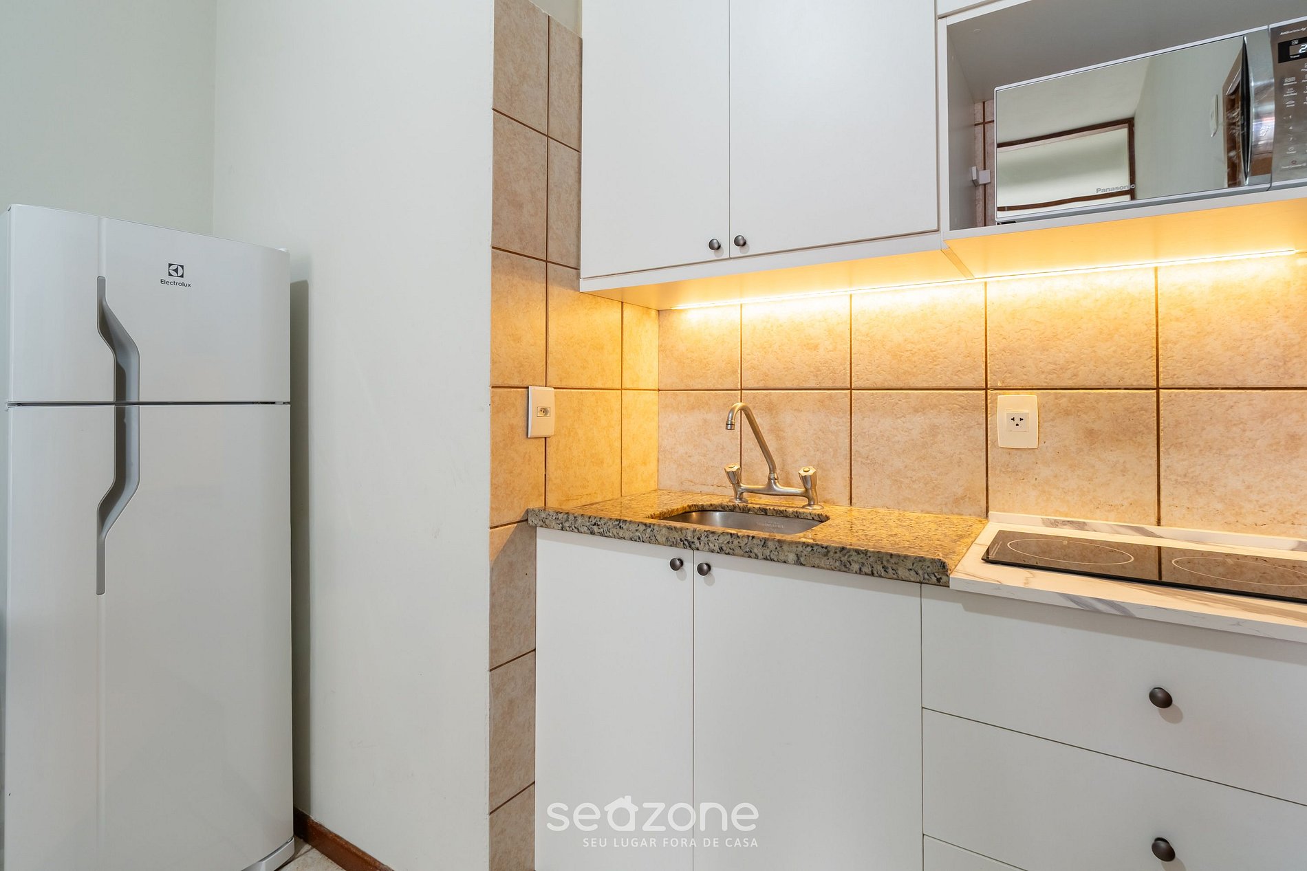 - Cozinha completa com frigobar, fogão cooktop, micro-ondas, cafeteira, panelas, louças e utensílios;