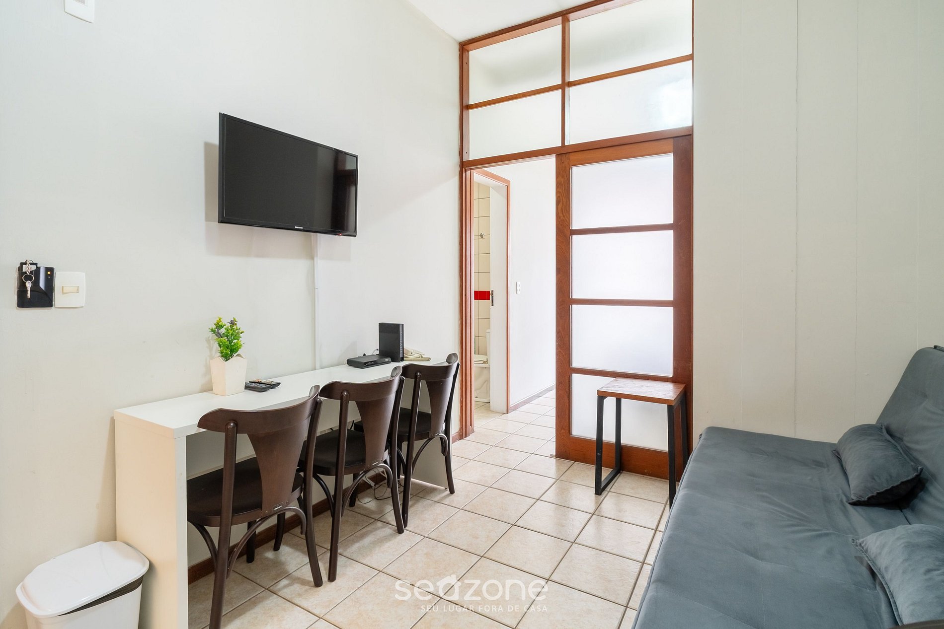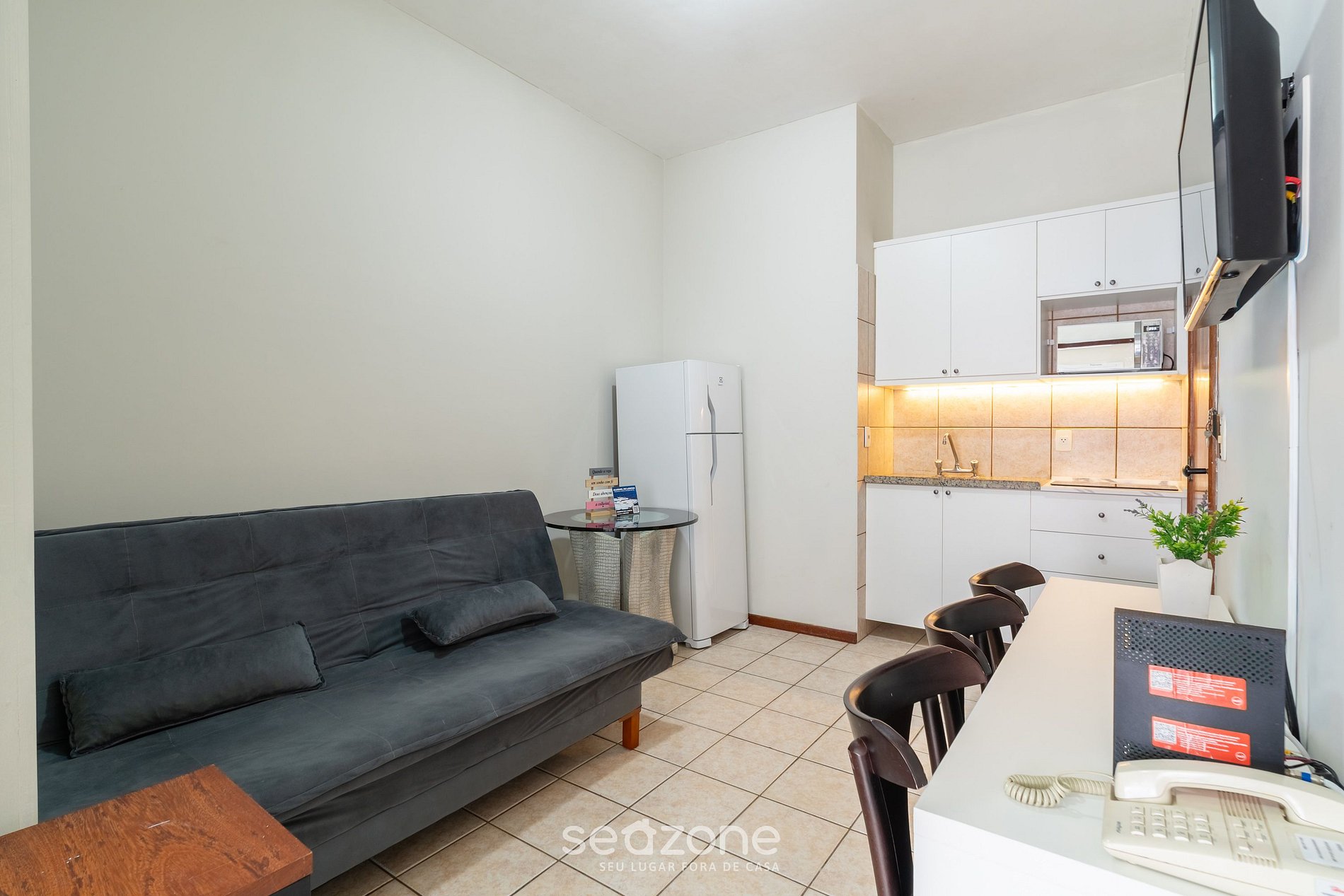 - Sala de estar com sofá-cama e TV de tela plana;
