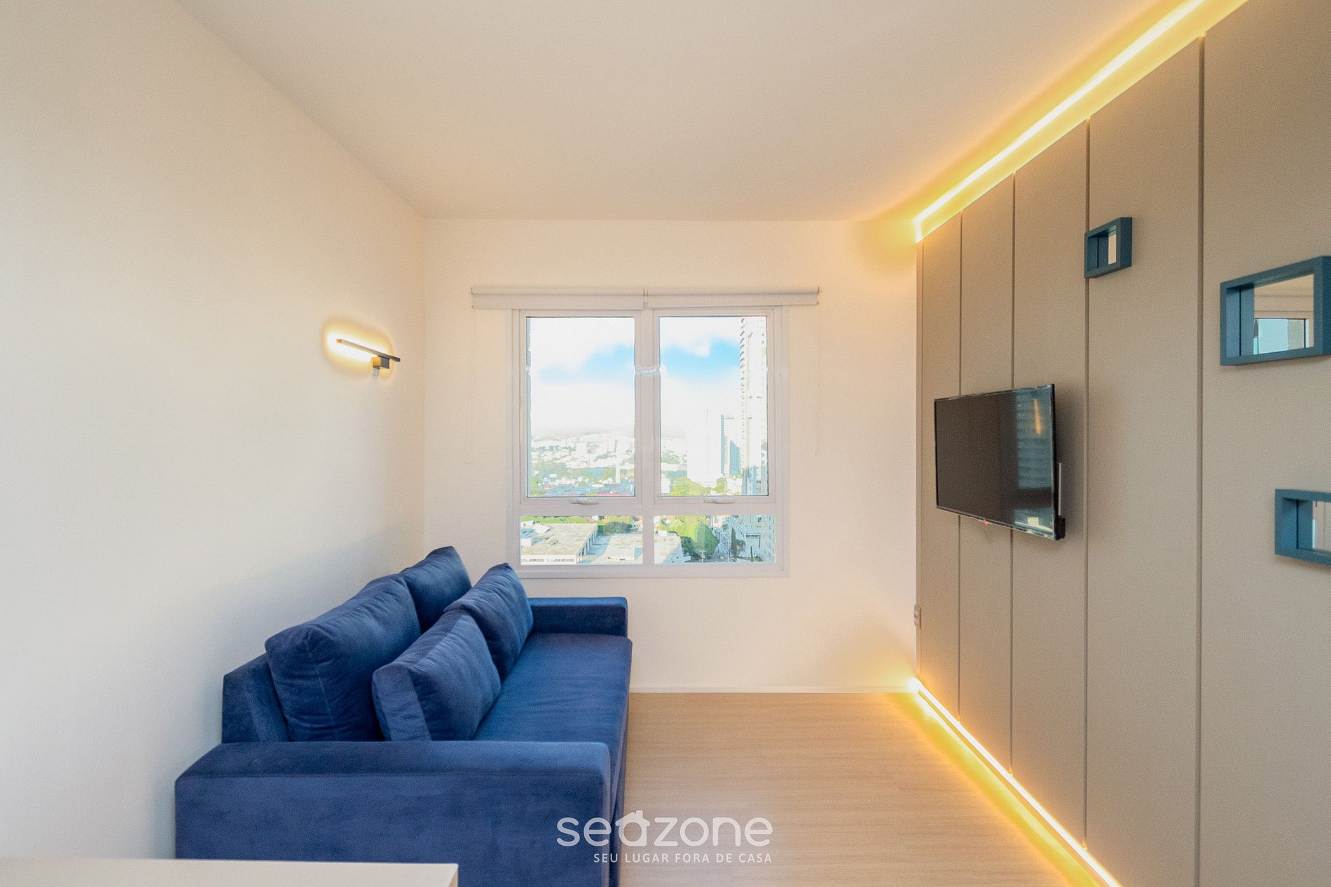 - Sala de estar com sofá, TV e ar-condicionado;