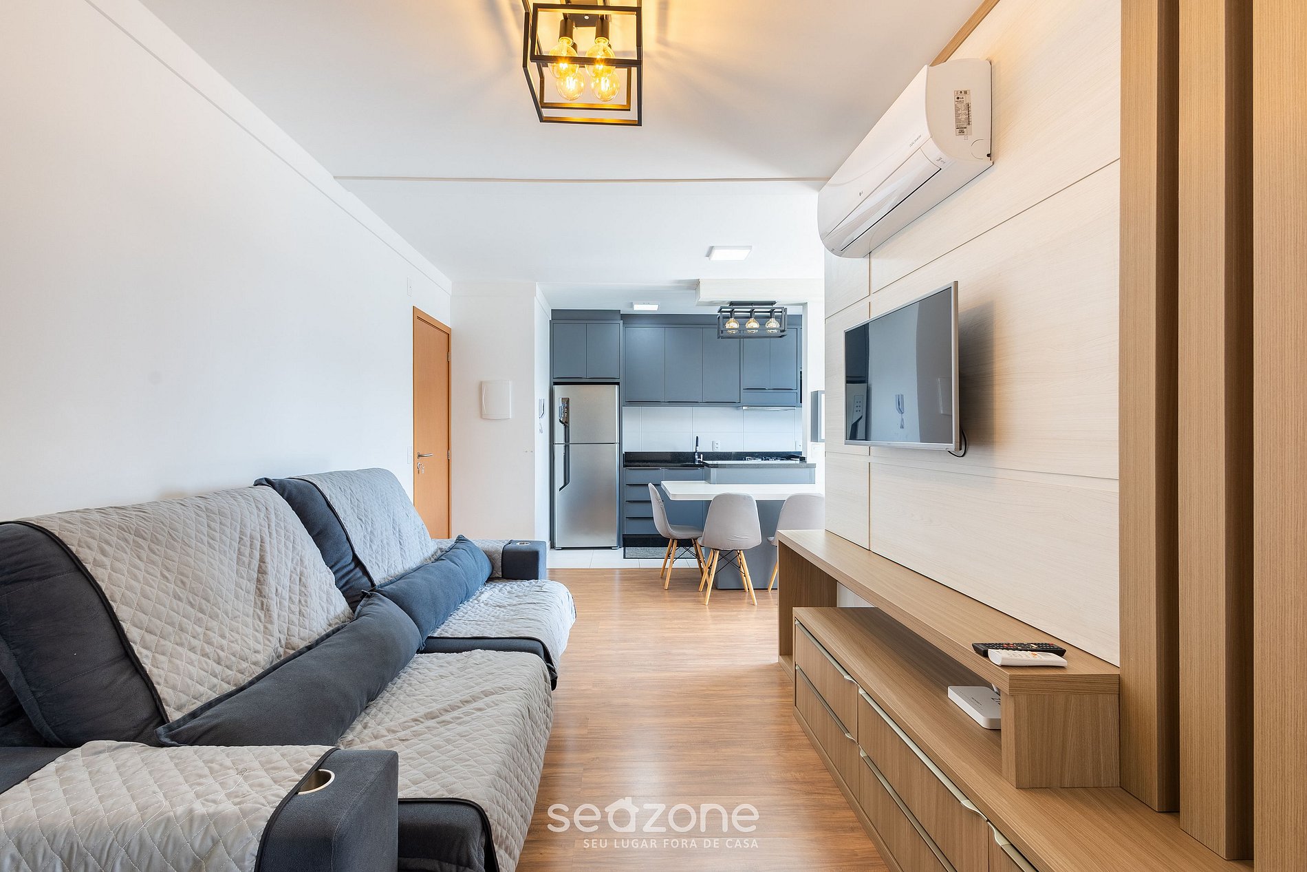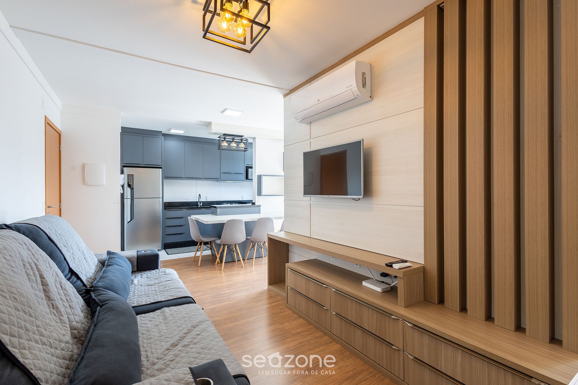 - Sala de estar com sofá, Smart TV, frigobar (cervejeira) e ar-condicionado;