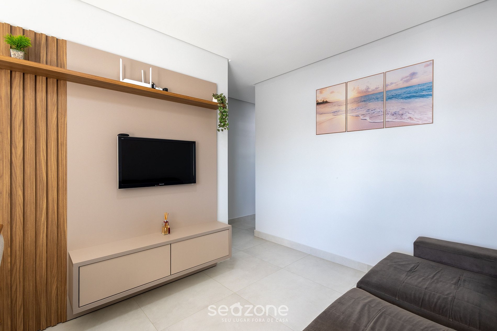 - Sala de estar com sofá, Smart TV e ventilador portátil;
