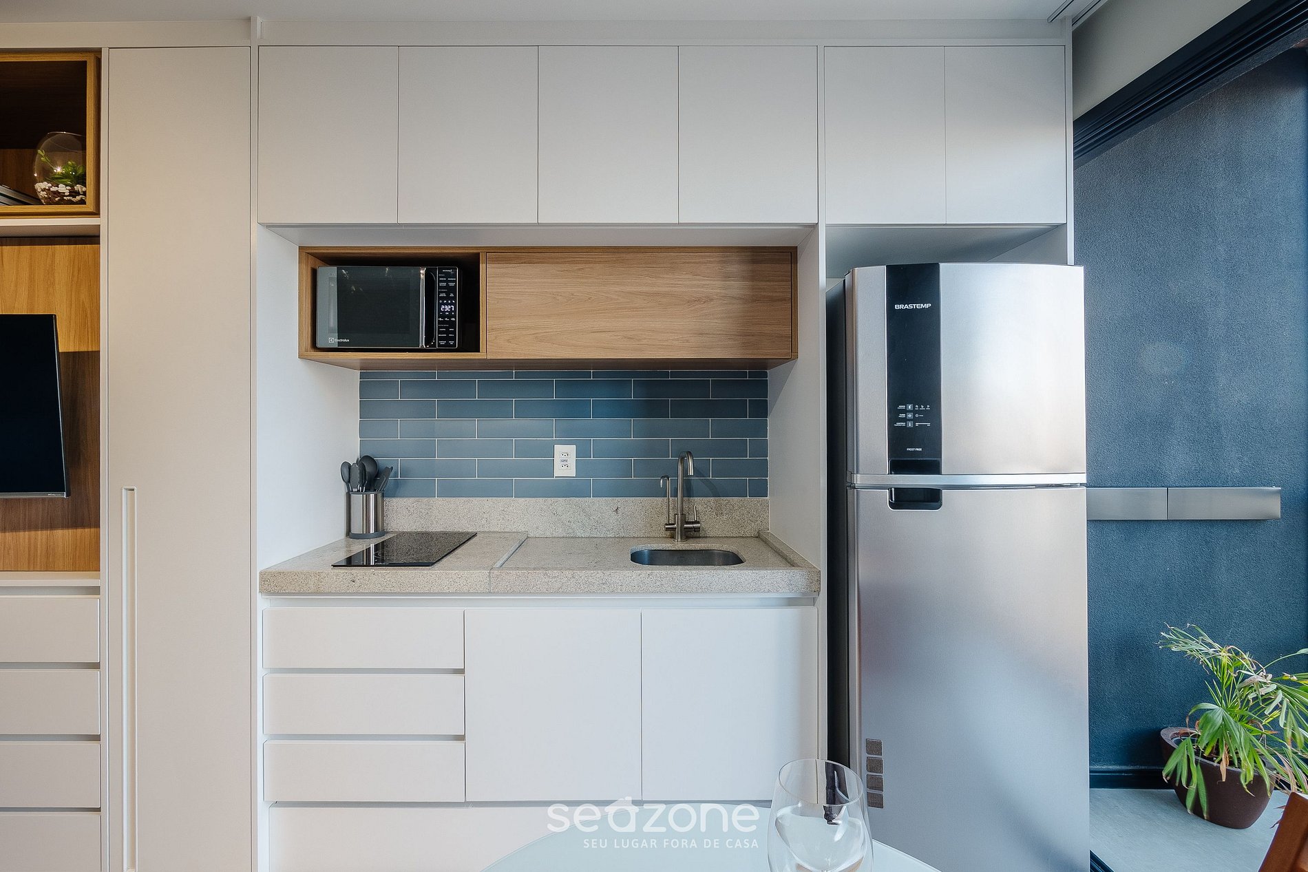 - Cozinha completa com geladeira, fogão cooktop por indução, sanduicheira, microondas, cafeteira elétrica, liquidificador, taças de vinho, panelas, louças e utensílios;