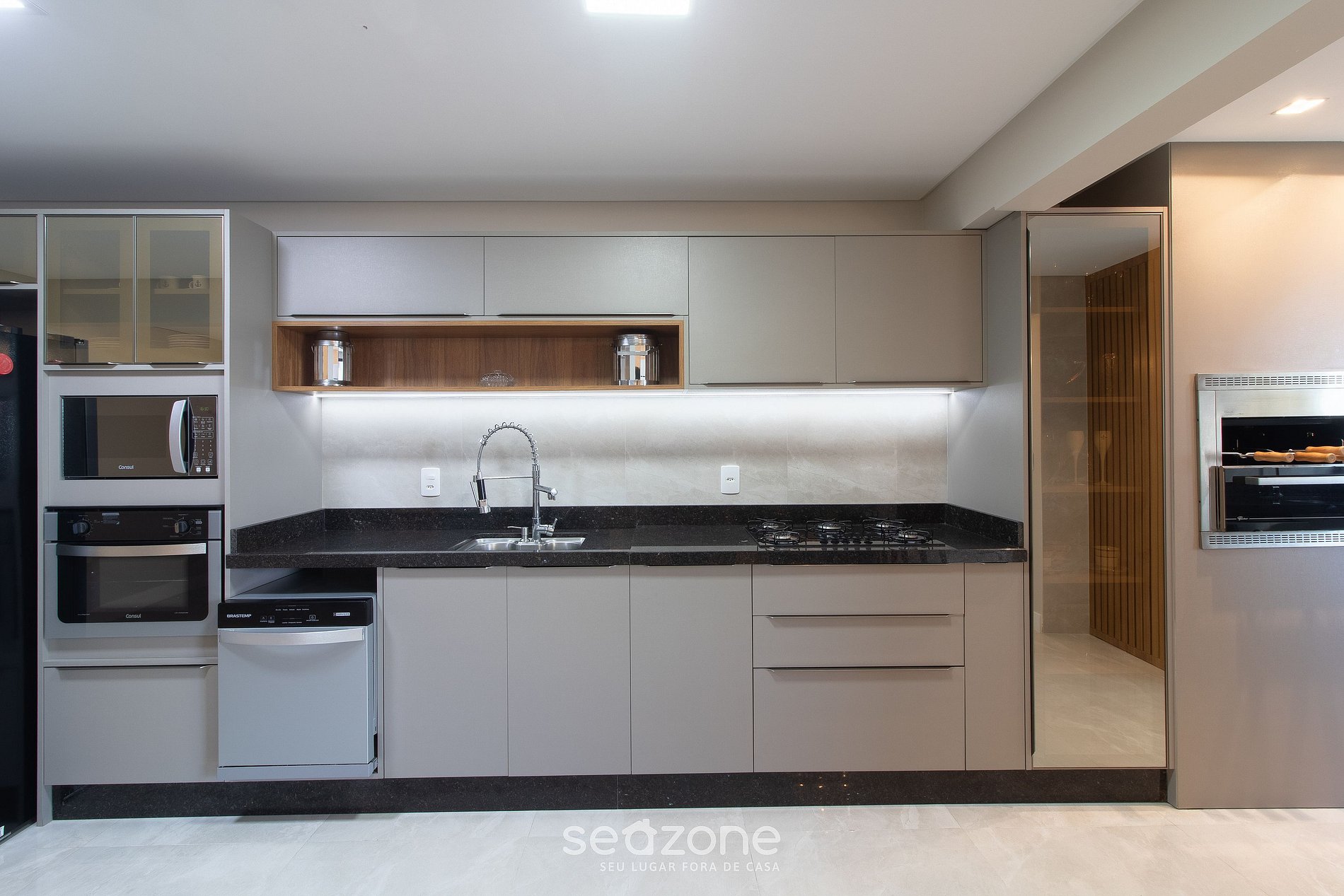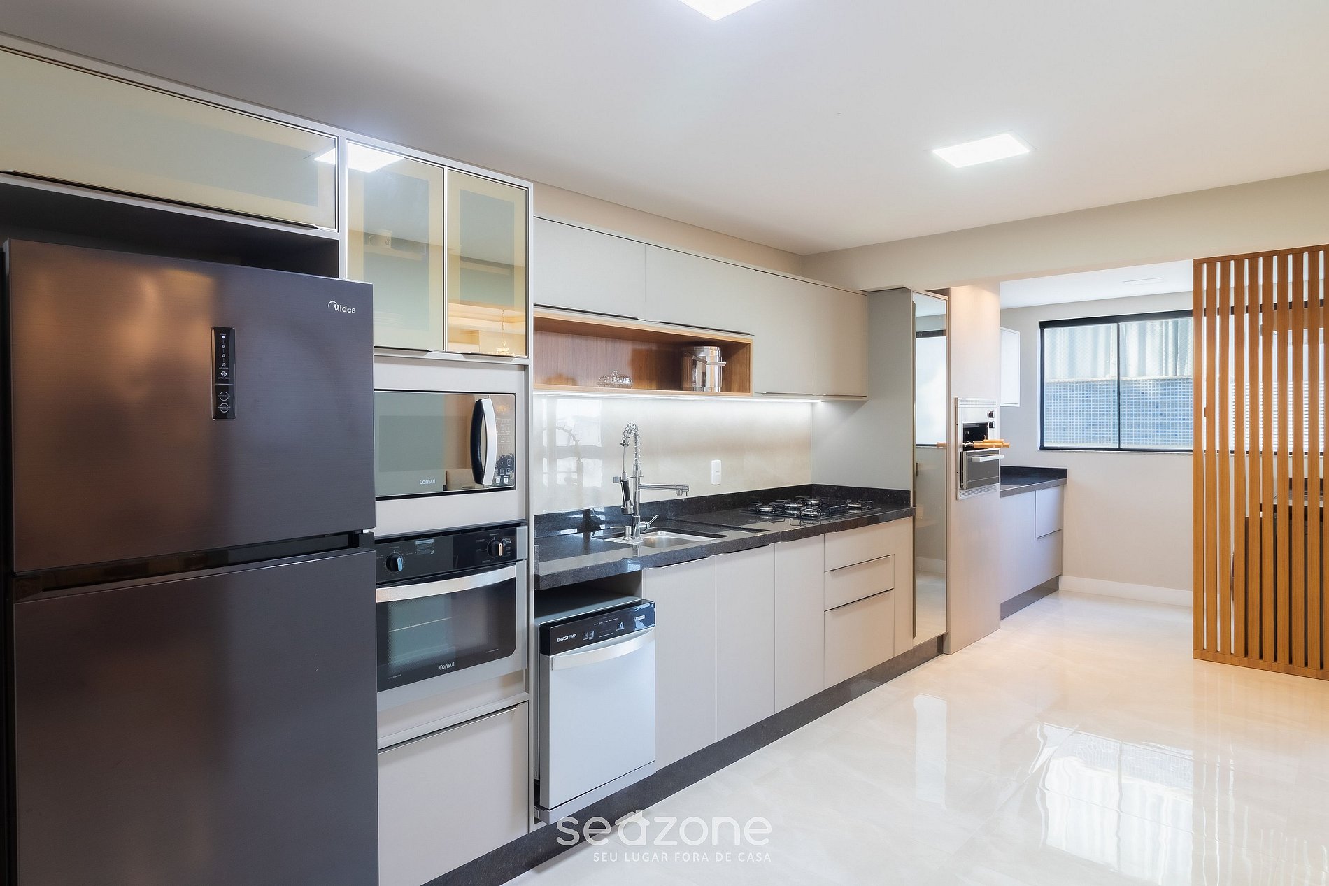 - Cozinha completa com geladeira, fogão cooktop (gás), forno elétrico, micro-ondas, sanduicheira, cafeteira elétrica, chaleira elétrica, liquidificador, lava louça, taças de vinho, panelas, louças e utensílios;