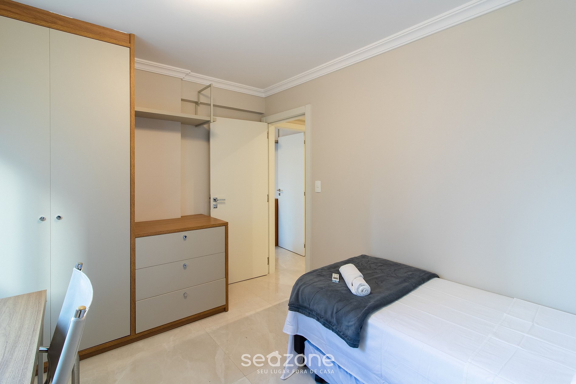 - 1 Quarto com cama de solteiro, armário, espaço para notebook e ar-condicionado;