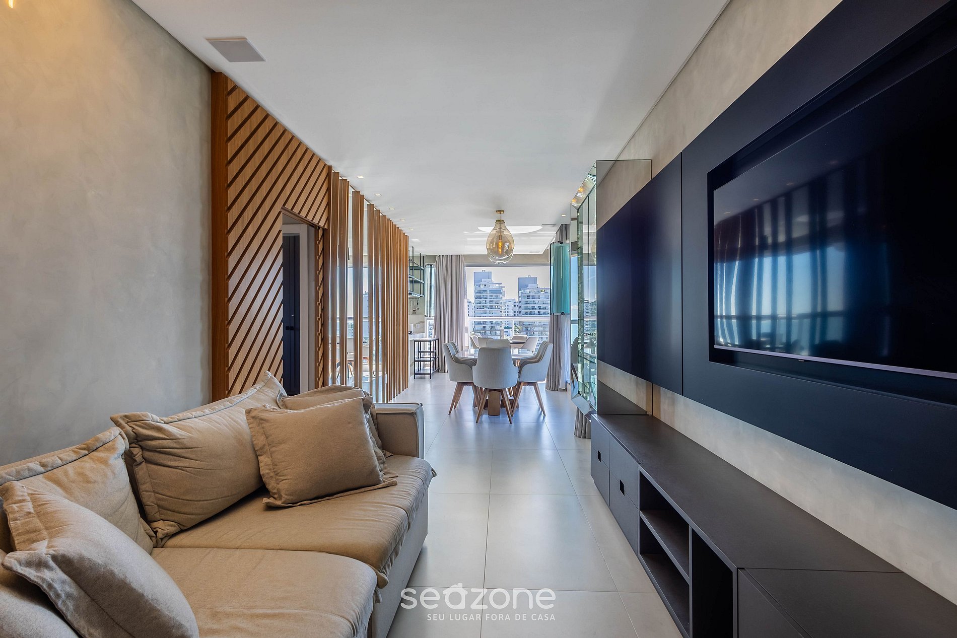 - Sala de estar com sofá, Smart TV e ar-condicionado;