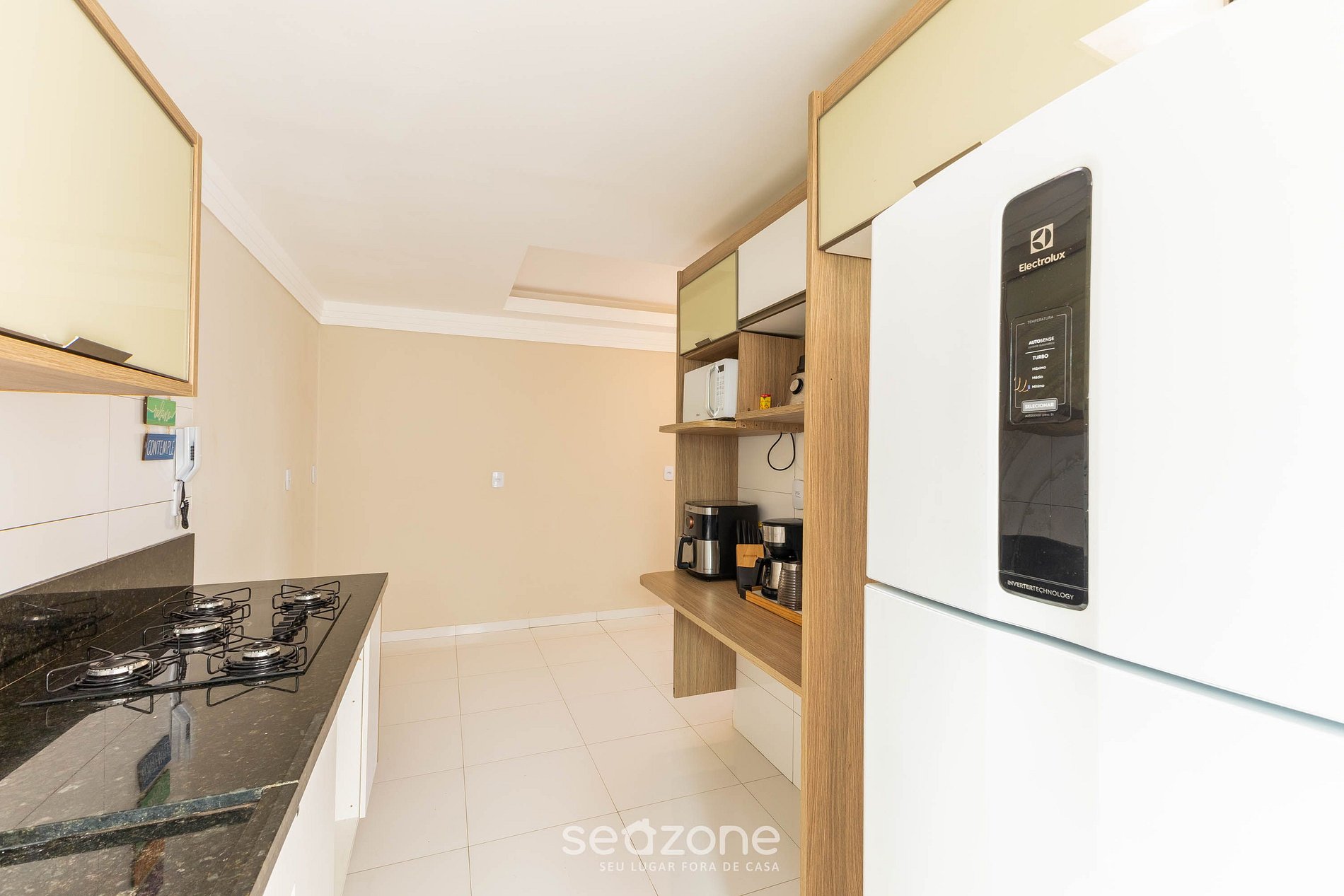 - Cozinha completa com geladeira, cooktop (a gás), micro-ondas, sanduicheira, cafeteira elétrica, chaleira, liquidificador, taças de vinho, panelas, louças e utensílios;