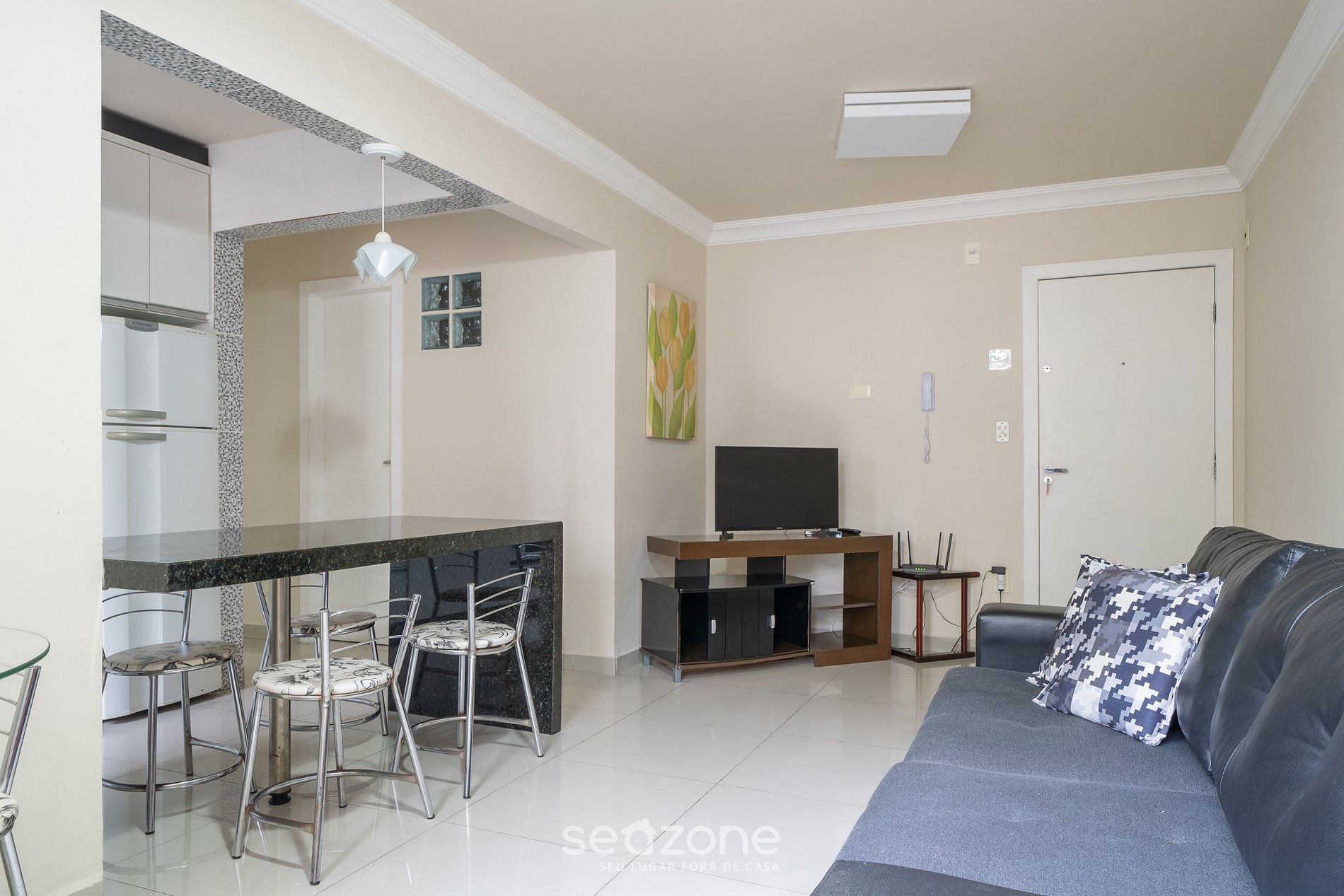 - Sala de estar com sofá e TV de tela plana;
