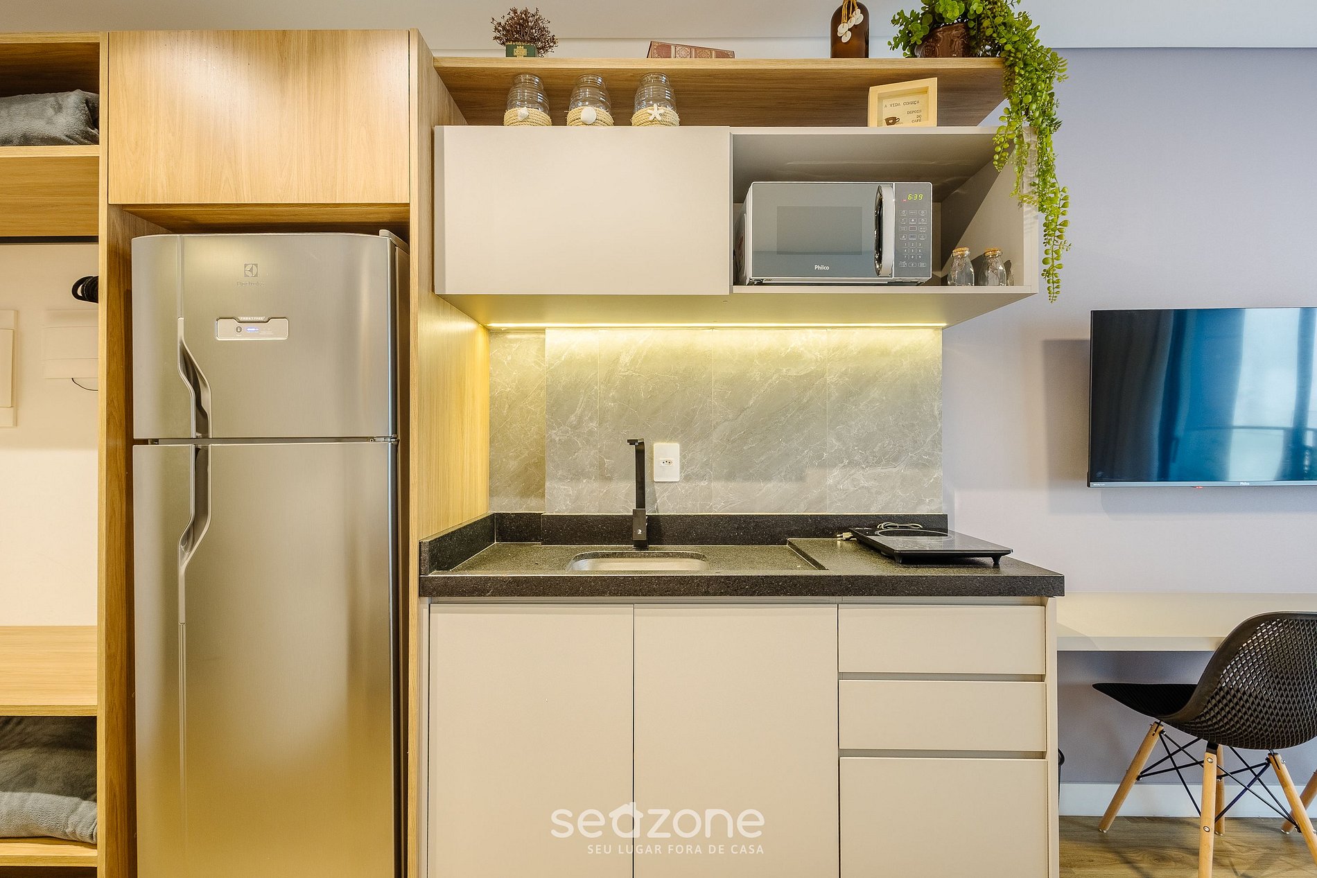 - Cozinha completa com geladeira, fogão cooktop (indução), micro-ondas, sanduicheira, kit café (suporte para filtro, garrafa térmica), chaleira elétrica, liquidificador, panelas, louças e utensílios;