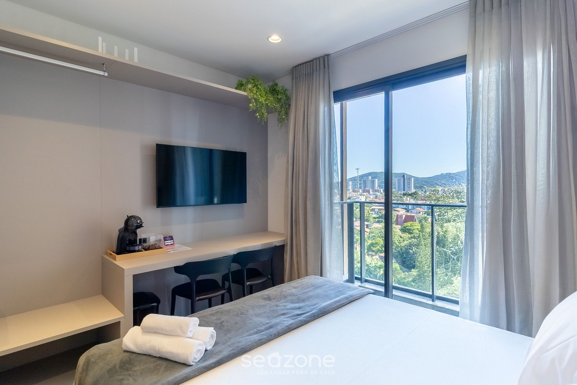 Studio moderno e aconchegante com cama queen, sofá-cama, smart TV e ar-condicionado. Cozinha completa e varanda com vista lateral para o mar. Desfrute de momentos de lazer na piscina do condomínio com borda infinita e área de convivência no Rooftop. A poucos passos da Praia de Armação do Itapocorói e perto do Beto Carrero.