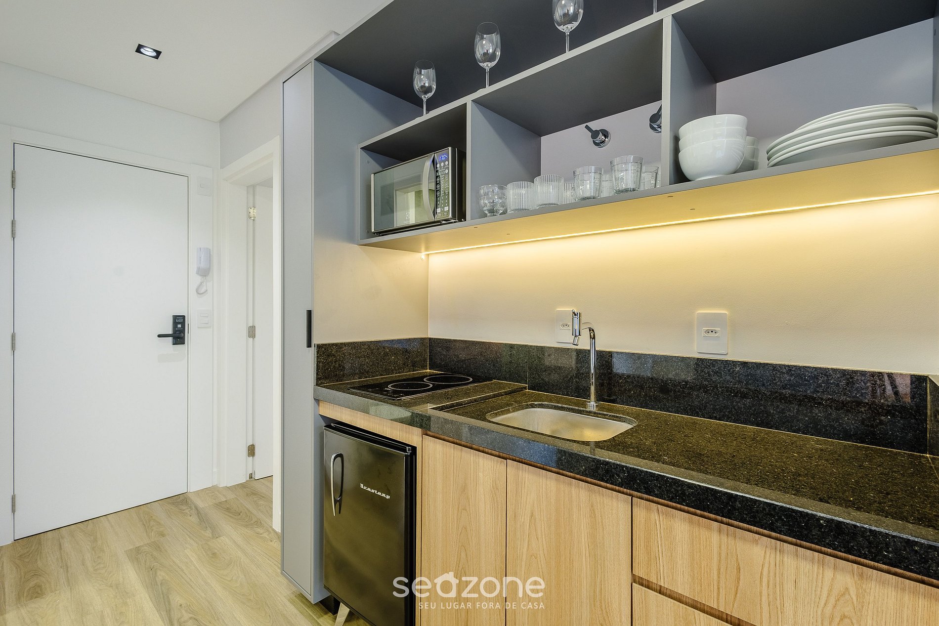- Cozinha completa com frigobar, fogão cooktop elétrico, microondas, sanduicheira, máquina de café (cápsula), chaleira elétrica, liquidificador, taças de vinho, panelas, louças e utensílios;