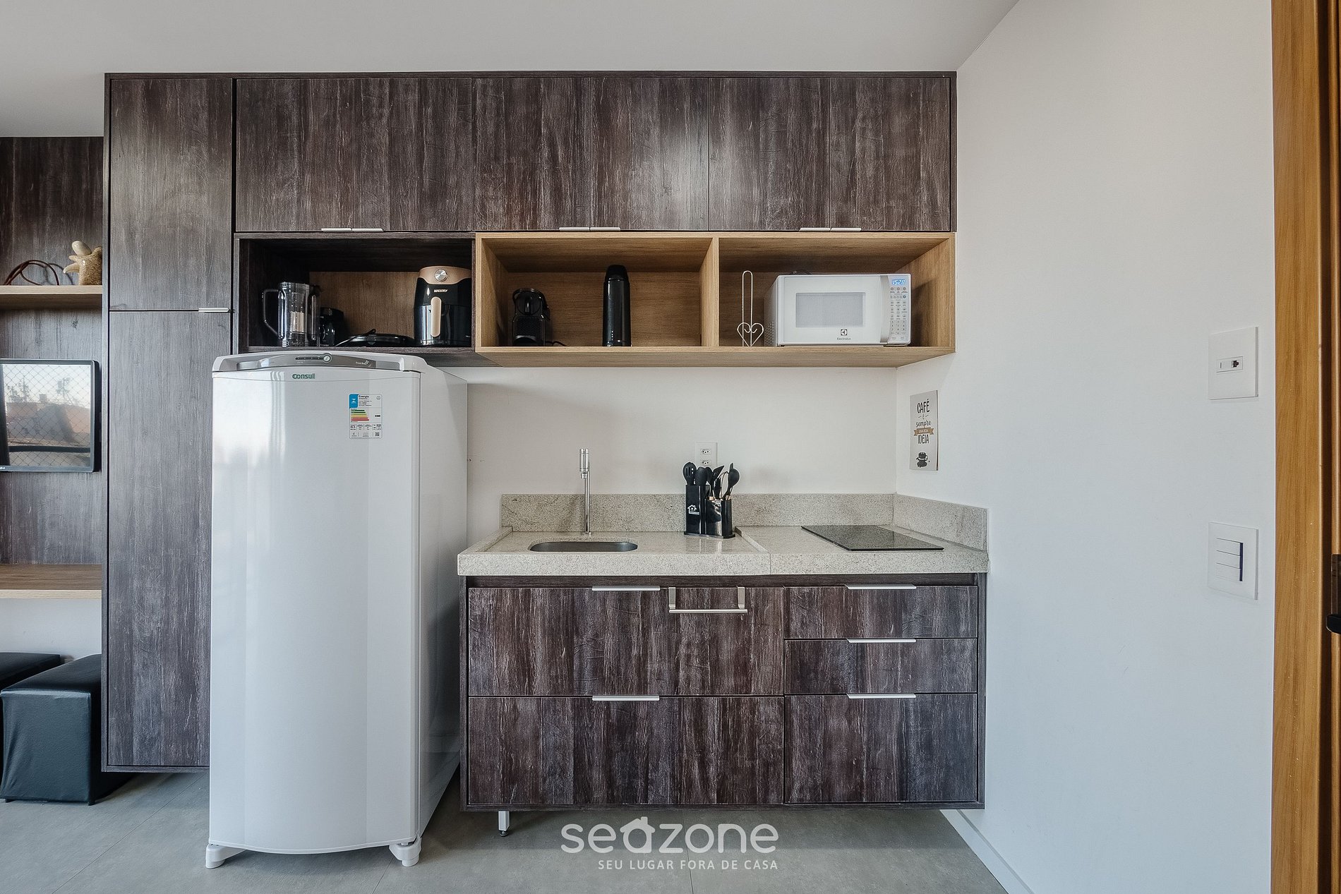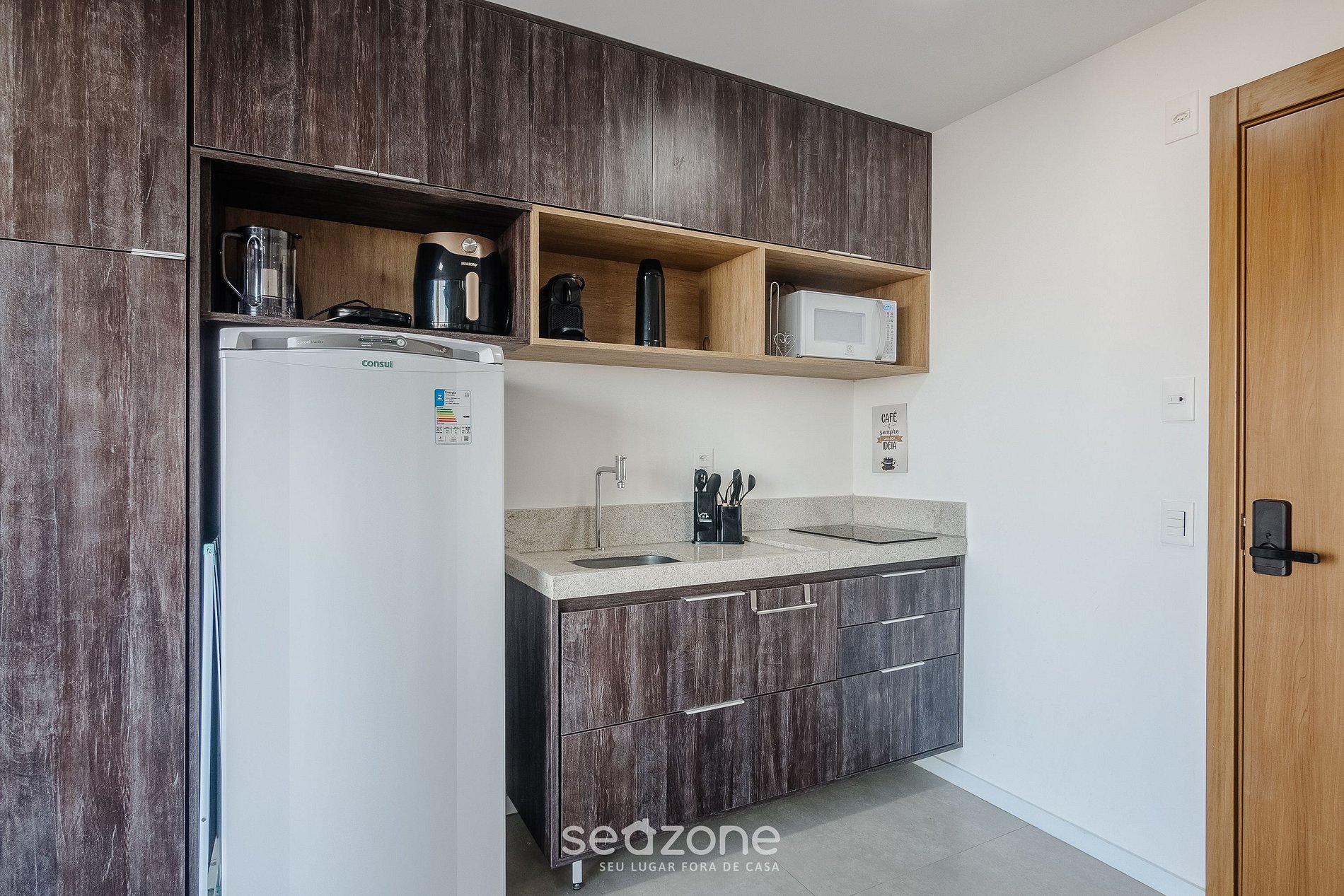 - Cozinha completa com geladeira, fogão cooktop por indução, microondas, Airfryer, sanduicheira, Kit café (suporte para filtro, garrafa térmica), liquidificador, taças de vinho, panelas, louças e utensílios;