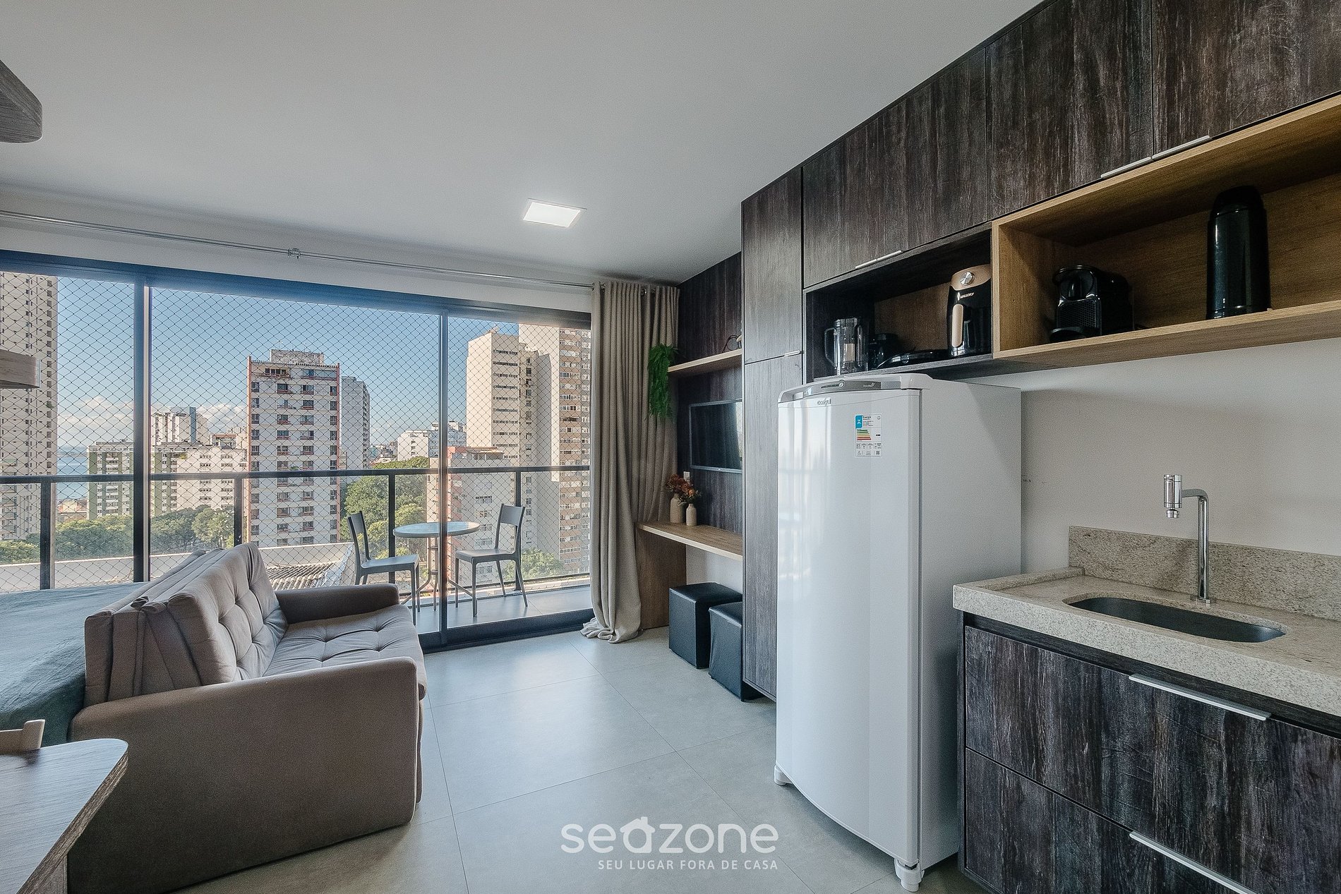Este charmoso studio em Vitória combina conforto e sofisticação.