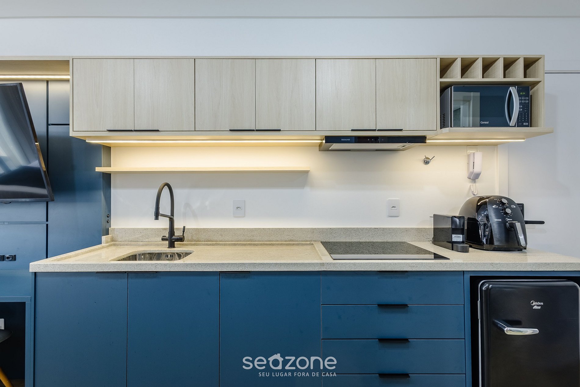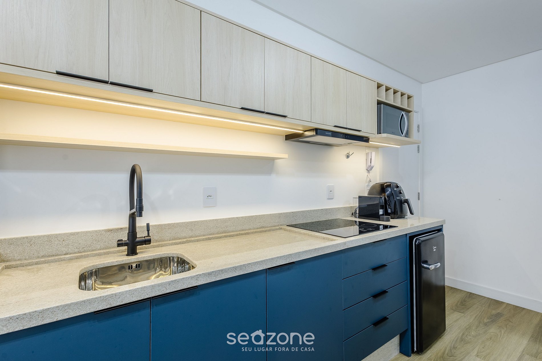 - Cozinha completa com frigobar, fogão cooktop (indução), microondas, sanduicheira, Airfryer, cafeteira elétrica, chaleira elétrica, liquidificador, taças de vinho, panelas, louças e utensílios;
