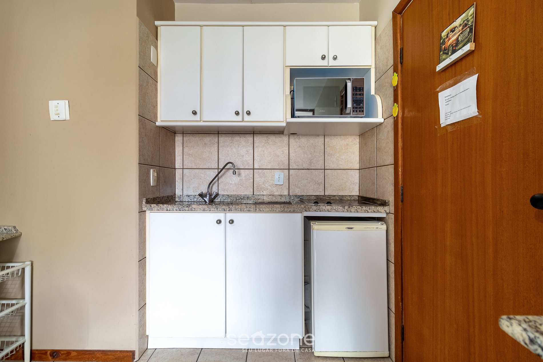 - Cozinha compacta com frigobar, fogão cooktop, micro-ondas, sanduicheira, cafeteira, liquidificador, panelas, louças e utensílios;