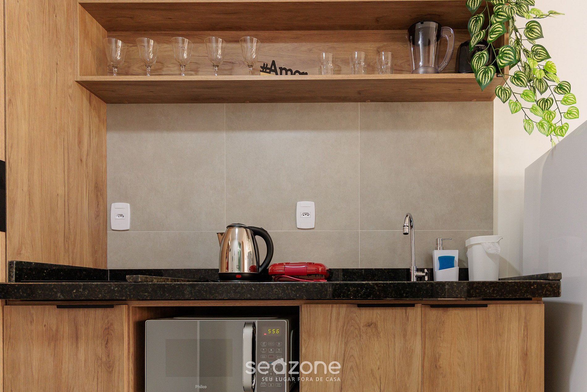 - Cozinha compacta com geladeira, fogão cooktop, micro-ondas, sanduicheira, cafeteira, liquidificador, panelas, louças e utensílios;